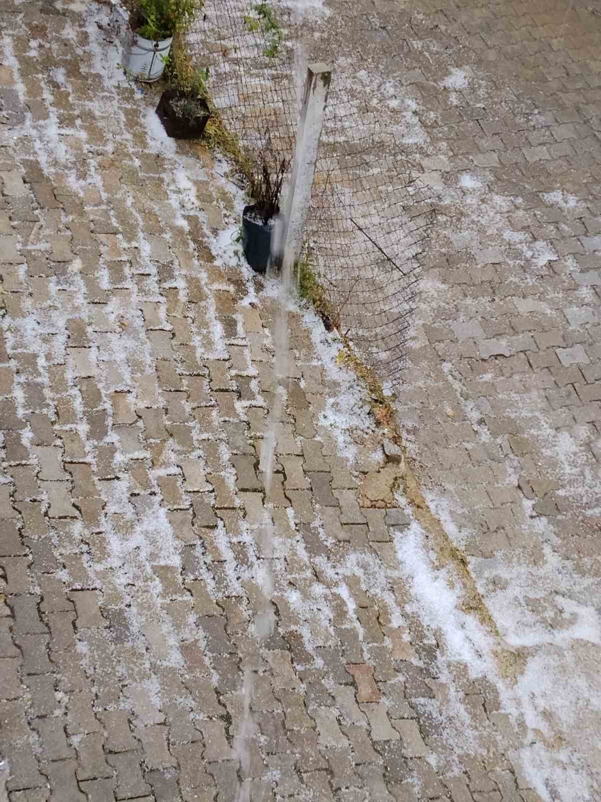 Aydın’ın Köşk ilçesinde etkili olan dolu yağışı sonrasında çatılar ve yollar kısa sürede beyaza büründü.