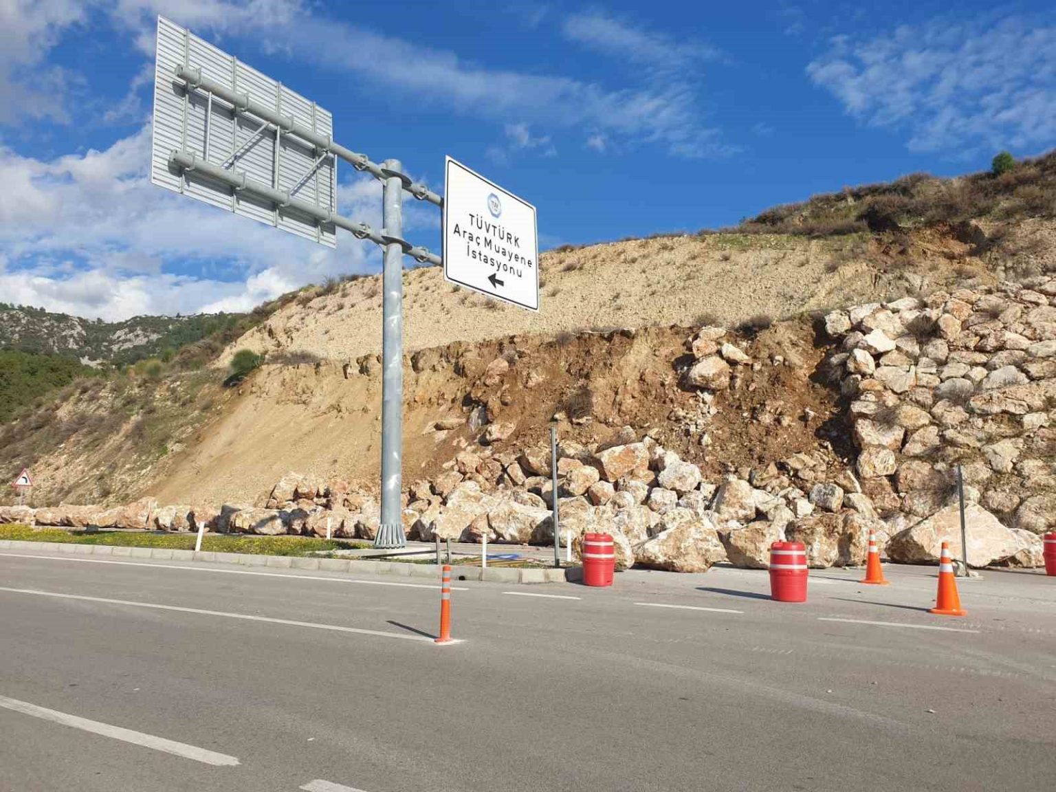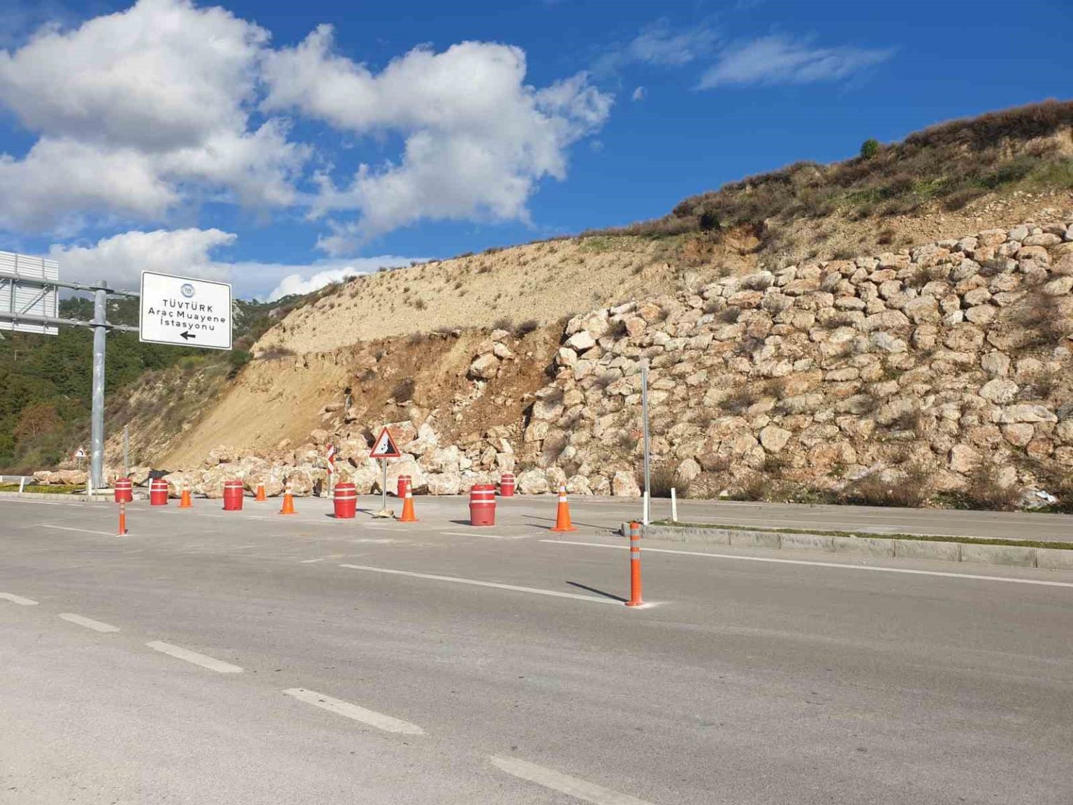 Antalya’nın Kumluca ilçesinde meydana gelen toprak kayması nedeniyle daha önce heyelan önlemi için örülen duvardaki kayalar D-400 Karayolu’na saçıldı. Kayalar şans eseri yoldan geçen araçlara isabet etmezken, ulaşım kontrollü olarak tek şeritten veriliyor.