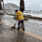 Kuşadası’nda dün sabah saatlerinden itibaren sağanak ve fırtına etkili oldu. Fırtına sebebiyle kabaran denizdeki dalgalar ve yağmur suları, sahil bandındaki kaldırımın üzerinin çamur, taş ile çöp benzeri atıklarla kaplanmasına neden oldu. Sabahın ilk ışıklarıyla birlikte yoğun bir mesaiye başlayan Kuşadası Belediyesi Temizlik İşleri Müdürlüğü ekipleri de vatandaşların mağduriyet yaşamaması için bölgede temizlik çalışması yürüttü. Bu kapsamda sahil bandı baştan sona biriken millerden arındırıldı. Ekiplerin özverisiyle geniş bir alanda gerçekleştirilen çalışma Kuşadalıların takdirini topladı.