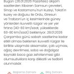 Meteoroloji Genel Müdürlüğü’nden yapılan açıklamaya göre, bugün akşam saatlerinden itibaren Samsun çevreleri ile Sinop ve Kastamonu’nun kuzeyi, Tokat’ın kuzey ve doğu kesimleri ile Ordu, Giresun ve Trabzon’un iç bölgelerinde güney yönlerden kuvvetli rüzgâr ve yer yer fırtına bekleniyor. Rüzgârın saatte 40 ila 60 kilometre, yüksek kesimlerde ise 60 ila 80 kilometre hızla esmesi öngörülüyor.