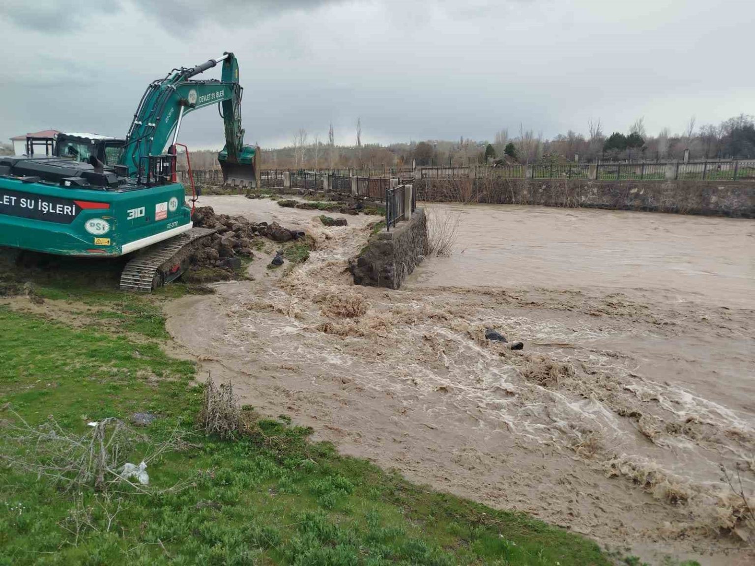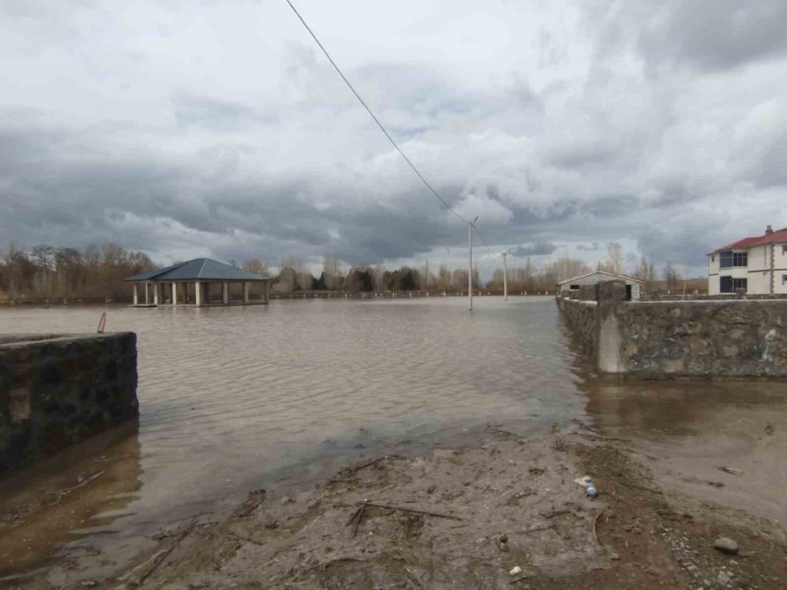 Muş’un Malazgirt ilçesinde etkili olan sağanak yağışın ardından dere taştı, bazı ev ve bahçeleri su bastı.