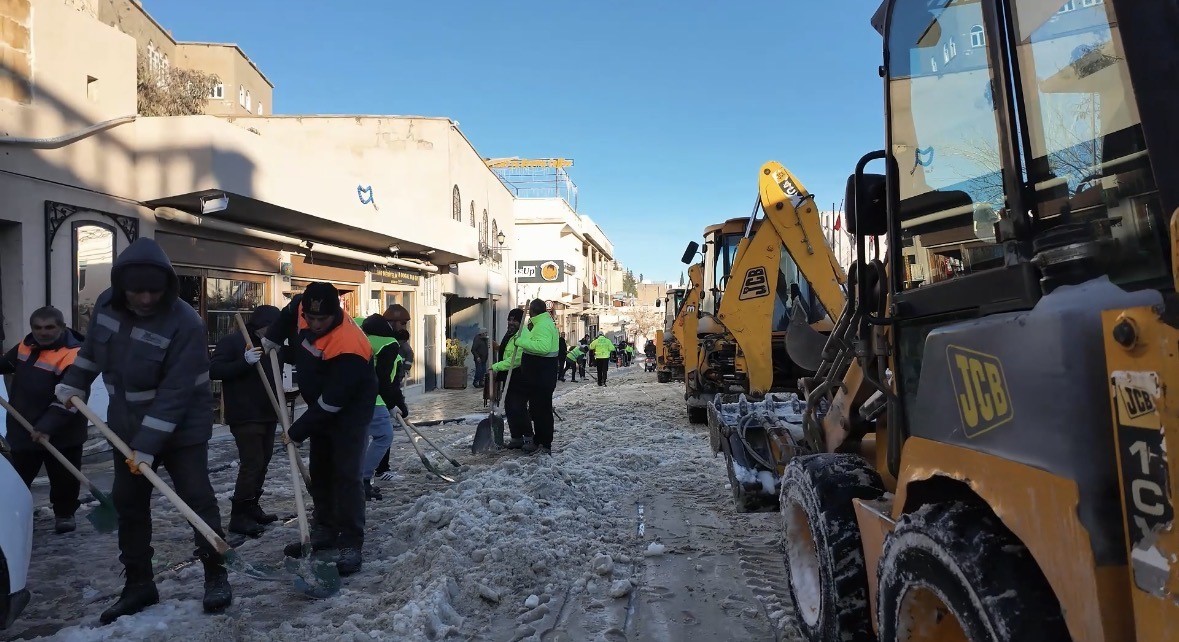 Mardin Büyükşehir Belediyesi ilçe merkezleri ve kırsal mahallelerde yol açma, kar küreme, kaldırım ve çevre temizleme çalışmalarını aralıksız sürdürüyor. Turistlerin yoğun olarak ziyaret ettiği Mardin 1. Cadde’de 130 personel, 9 çift kabin, 6 JCB ile yol ve kar temizleme çalışması yürüttüklerini aktaran Büyükşehir Belediyesi Çevre Koruma ve Kontrol Daire Başkanı Halef Eraslan, “Tarihi şehrimize gelen vatandaşlarımızın mağdur olmamaları için gece gündüz 24 saat esasıyla çalışmalarımıza devam ediyoruz” dedi.