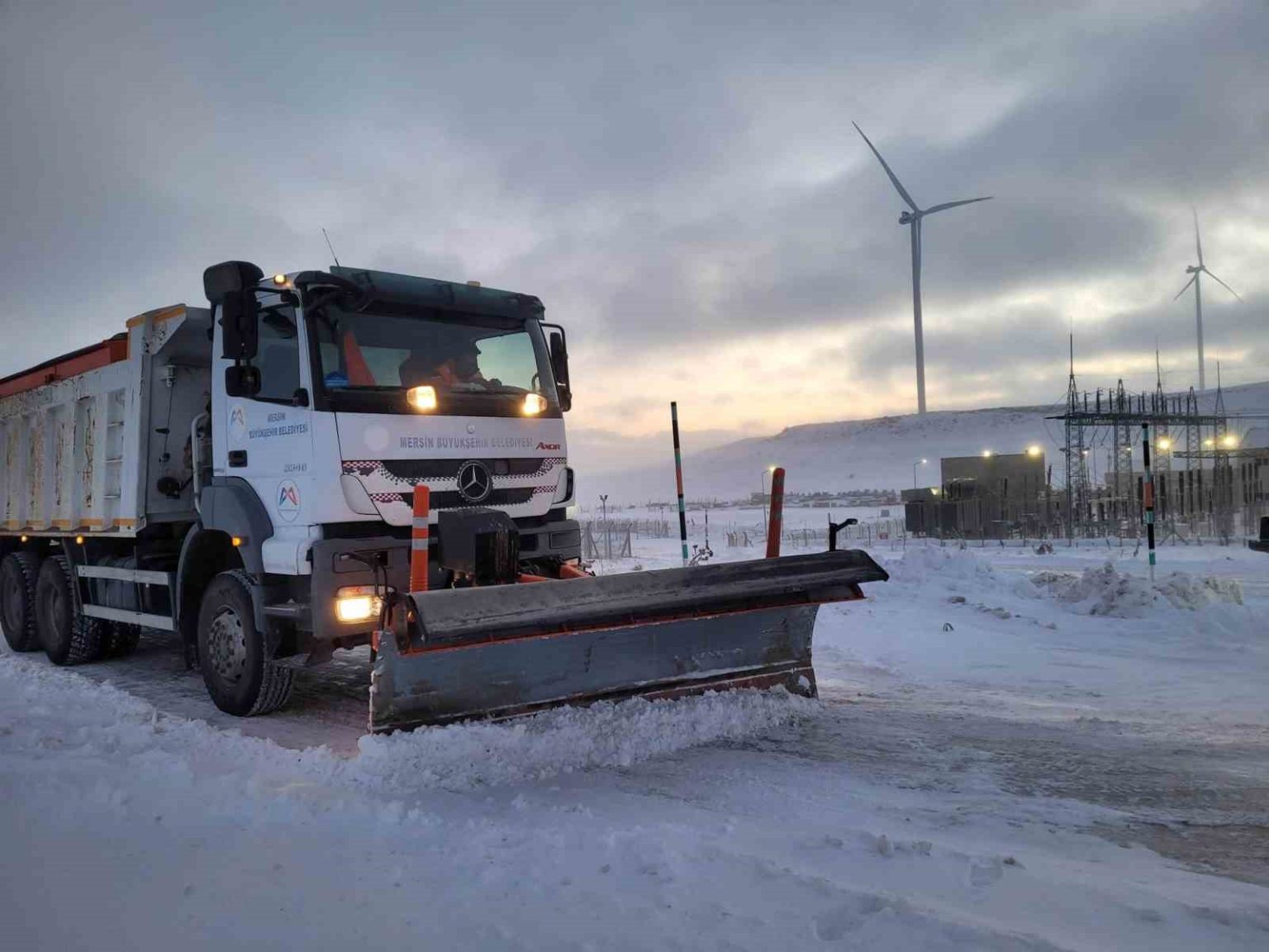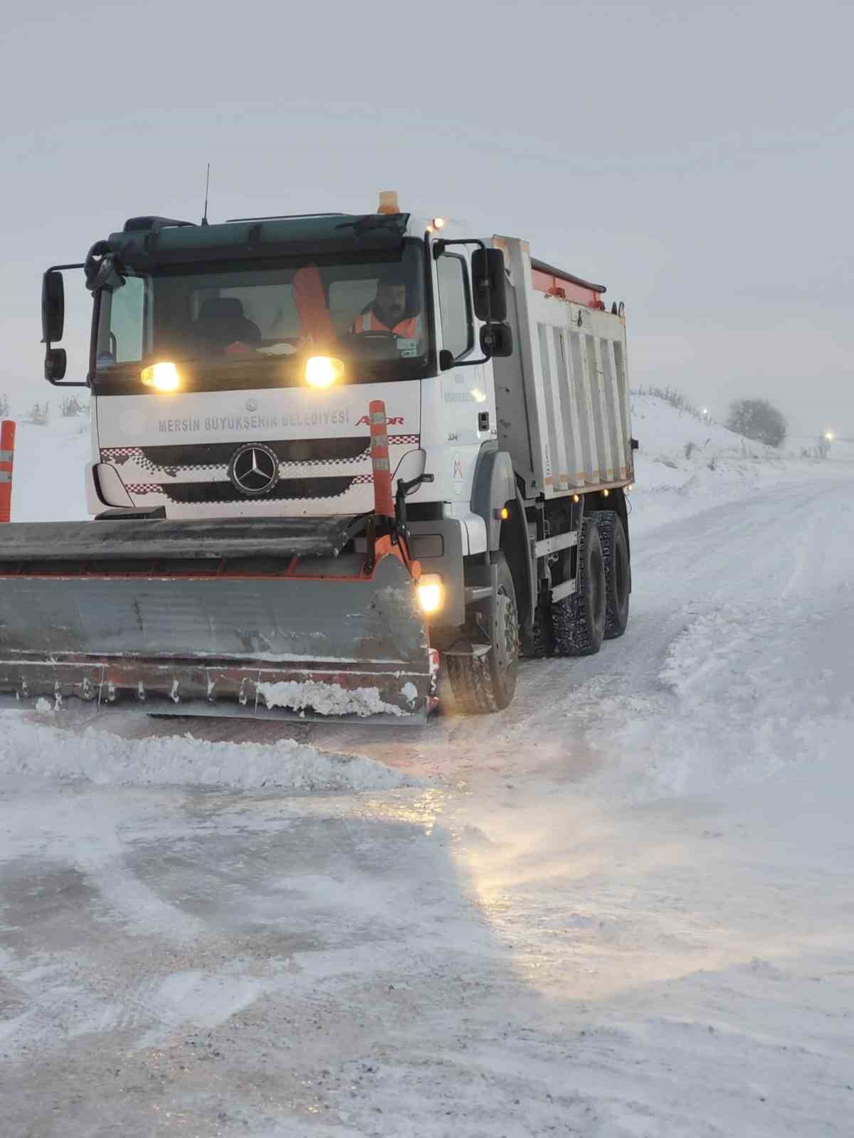 Mersin Büyükşehir Belediyesi ekipleri, Mut ilçesinin yüksek kesimlerinde etkili olan kar yağışı sonrasında kar küreme ve tuzlama çalışmaları yaparak kırsalda yolları açık tutmaya çalışıyor.
