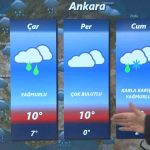 “İstanbul’da çarşamba günü yağış beklemiyoruz ama Perşembe, Cuma günü sağanak yağış var. İstanbul’da hava sıcaklığı 10-12 derece civarında olacak. Ankara’da da yağışların devam etmesini bekliyoruz. Ankara’da Cuma günü yer yer karla karışık yağmur, yükseklerinde hafif kar yağışı görülebilir. Hava sıcaklığına bakacak olursak gece sıcaklıkları sıfır dereceye kadar düşecek. Gündüz sıcaklığı iyi 9-10 derece civarında. İzmir’de de sağanak ve gök gürültülü yağışın Cuma’ya kadar devam edeceğini bekliyoruz. Hava sıcaklığı 16-17 derece civarında olacak.”