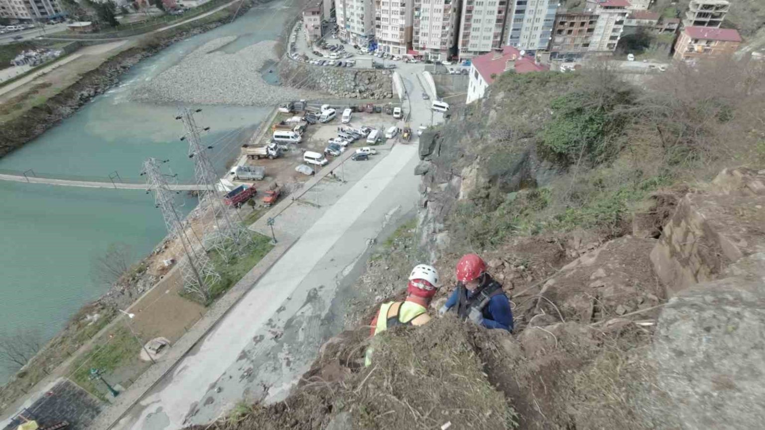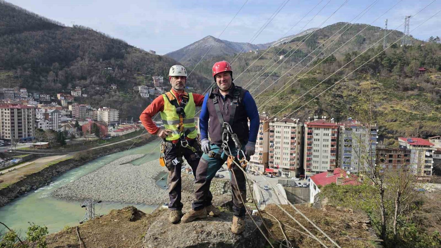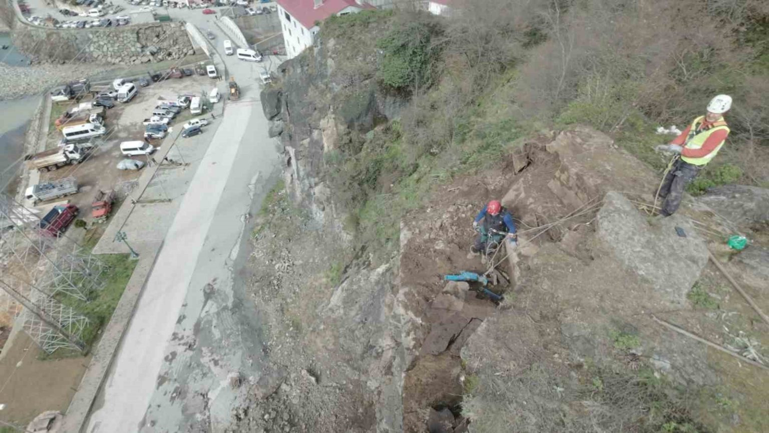 Yamaçlarda metrelerce yükseklikte çalışan endüstriyel dağcılar, zorlu şartlara rağmen yaptıkları müdahalelerle hem yol güvenliğini sağlıyor hem de olası kazaların önüne geçiyor.