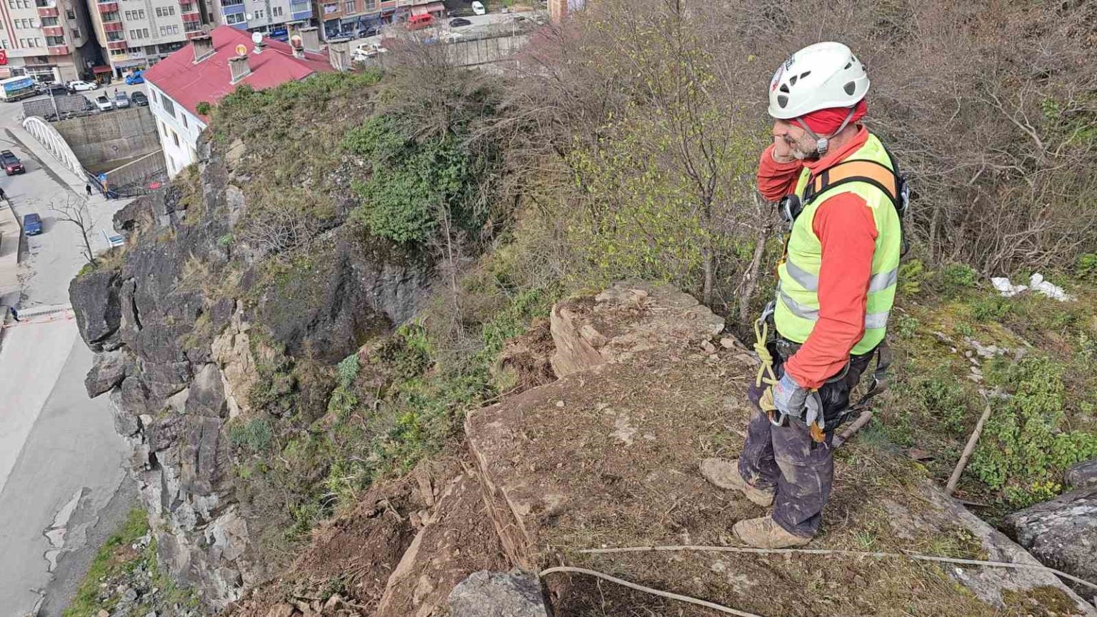 Endüstriyel dağcı Soner Özçelik, yaptıkları işin ciddi tecrübe ve dikkat gerektirdiğini belirterek “Erişimi zor bölgelere ip kullanarak ulaşıyoruz. Orada gerekli iş çözümlerini gerçekleştiriyoruz. Burada da riskli bir alan vardı. Düşme tehlikesi bulunan taş ve kaya kütlelerini güvenli ve kontrollü bir şekilde düşürerek tehlikeyi ortadan kaldırıyoruz” dedi.