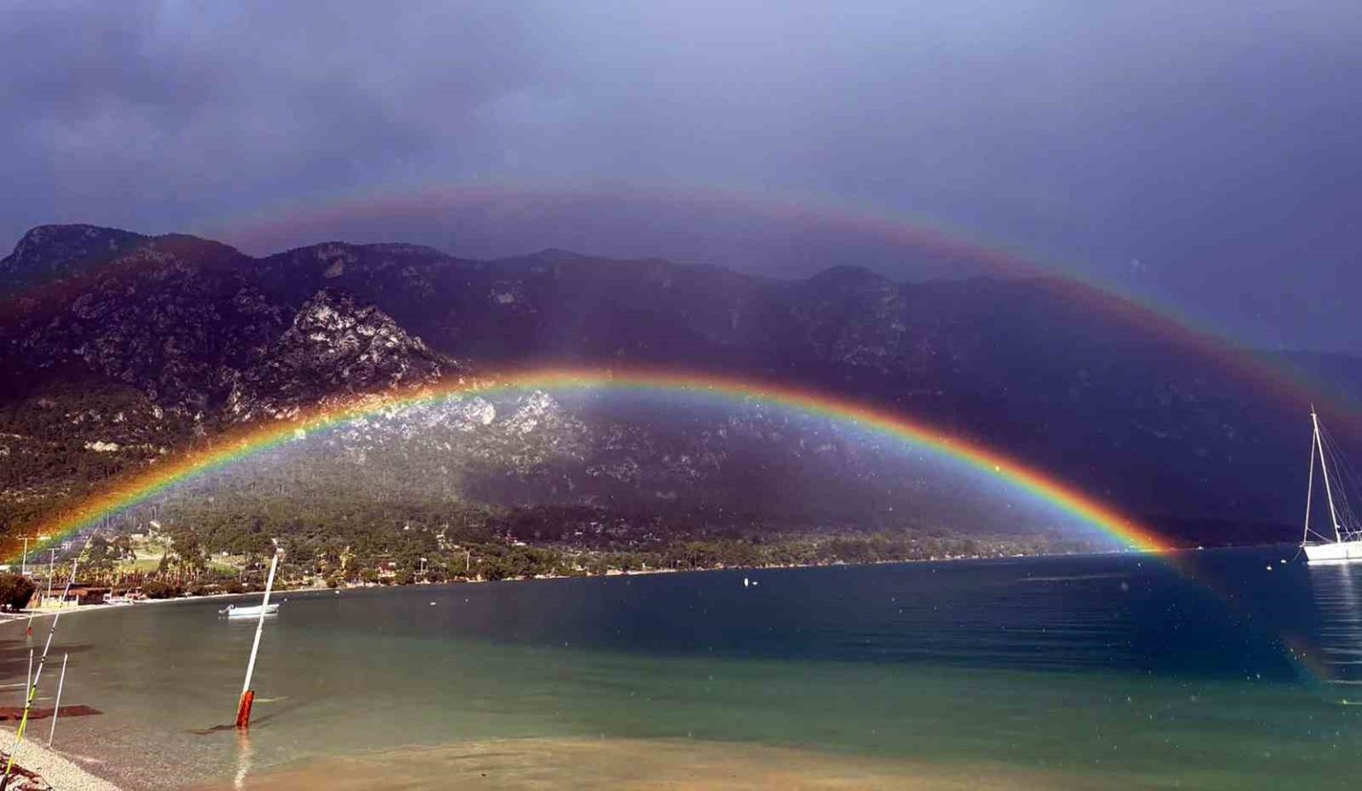 Muğla’da yağış sonrası Menteşe ilçesi sınırlarında bulunan Akbük Koyu’nda oluşan gökkuşağı, sahilde bulunan vatandaşlar tarafından görüntülendi.