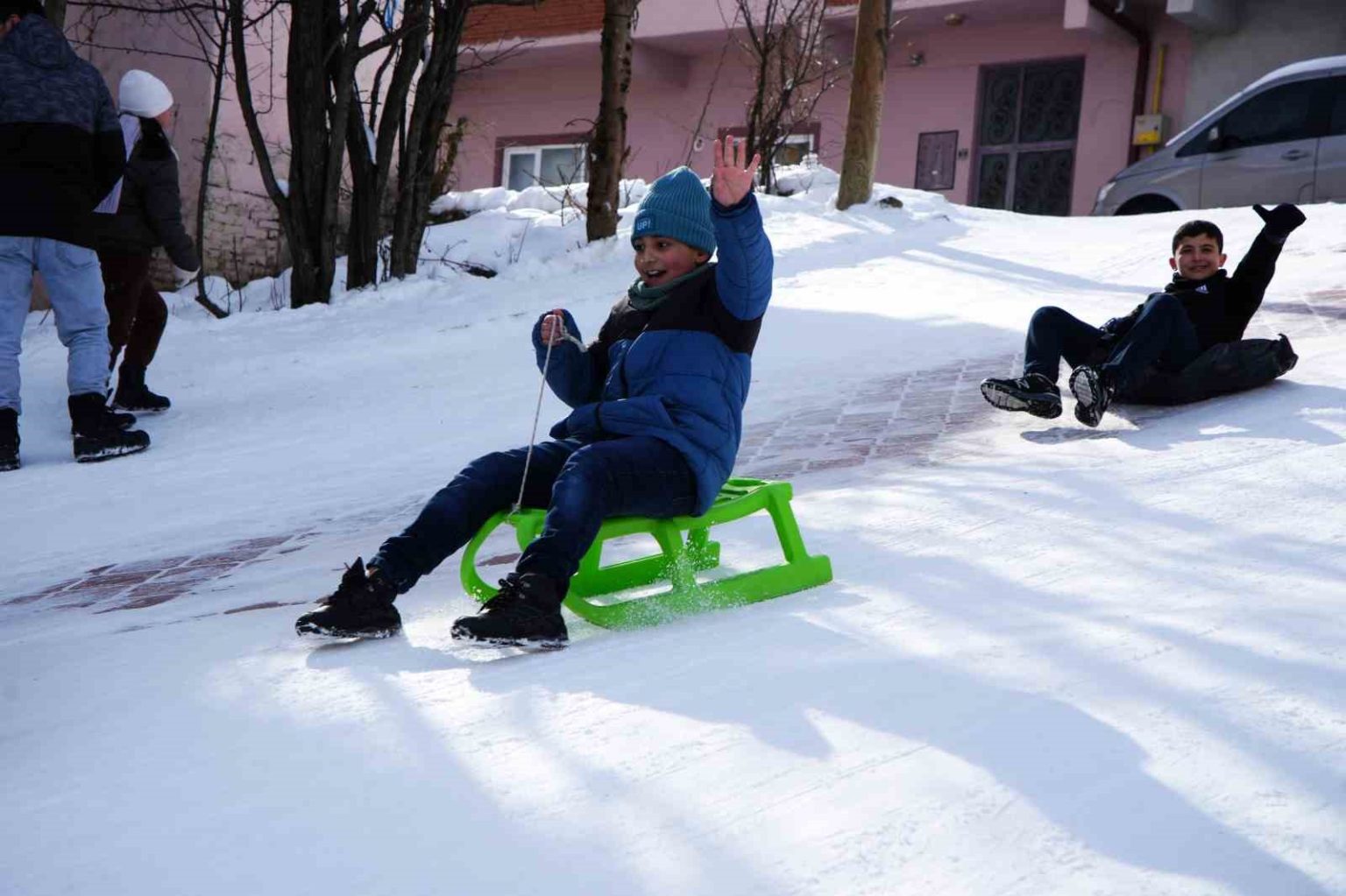 Kızaklarla kayan çocukların eğlenceli anları kameralara yansırken, mahalledeki büyükler de çocukları izleyerek keyifli anlara ortak oldu. Her yıl bu yokuşta kaydıklarını belirten çocuklar, burada çok eğlendiklerini ifade etti.