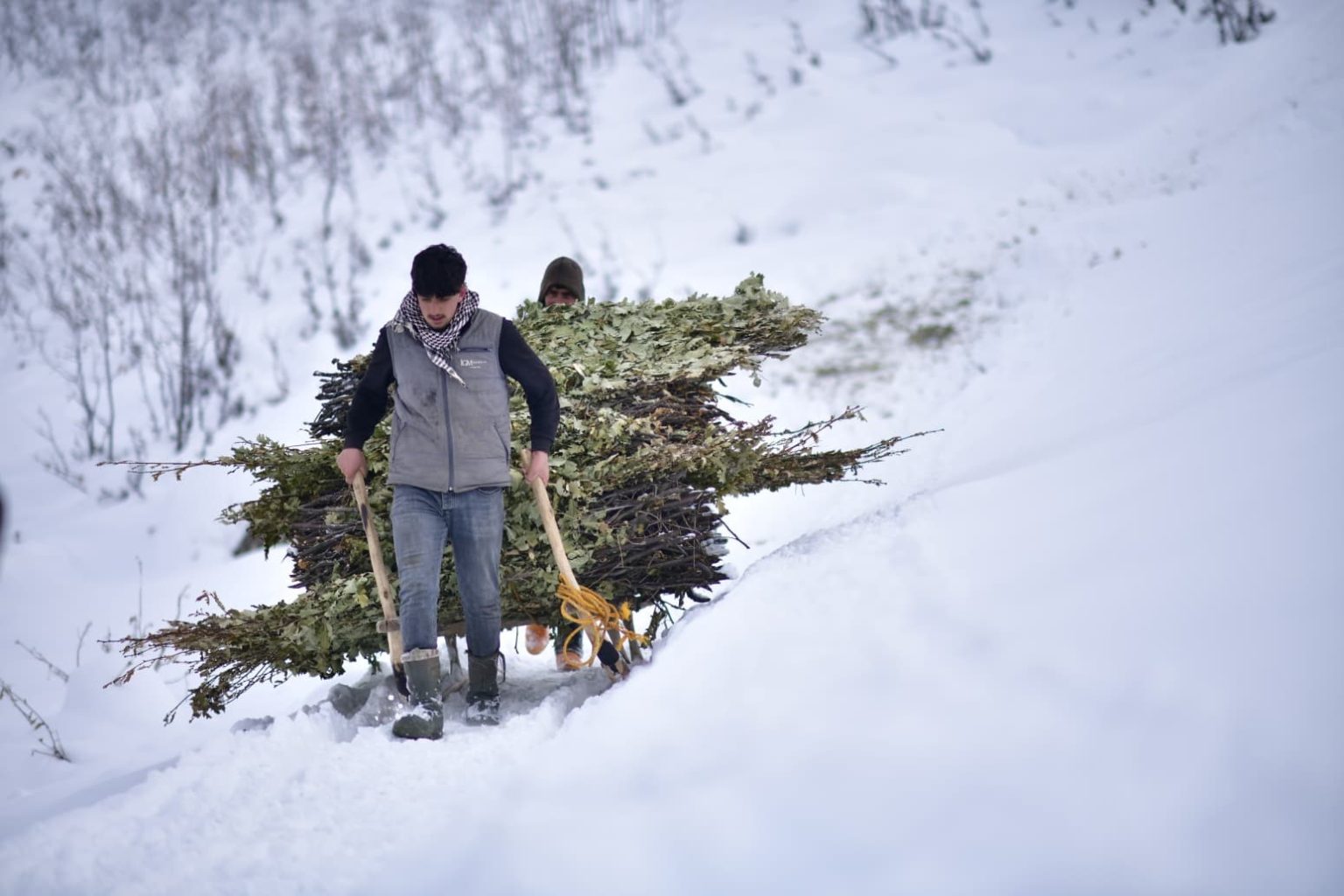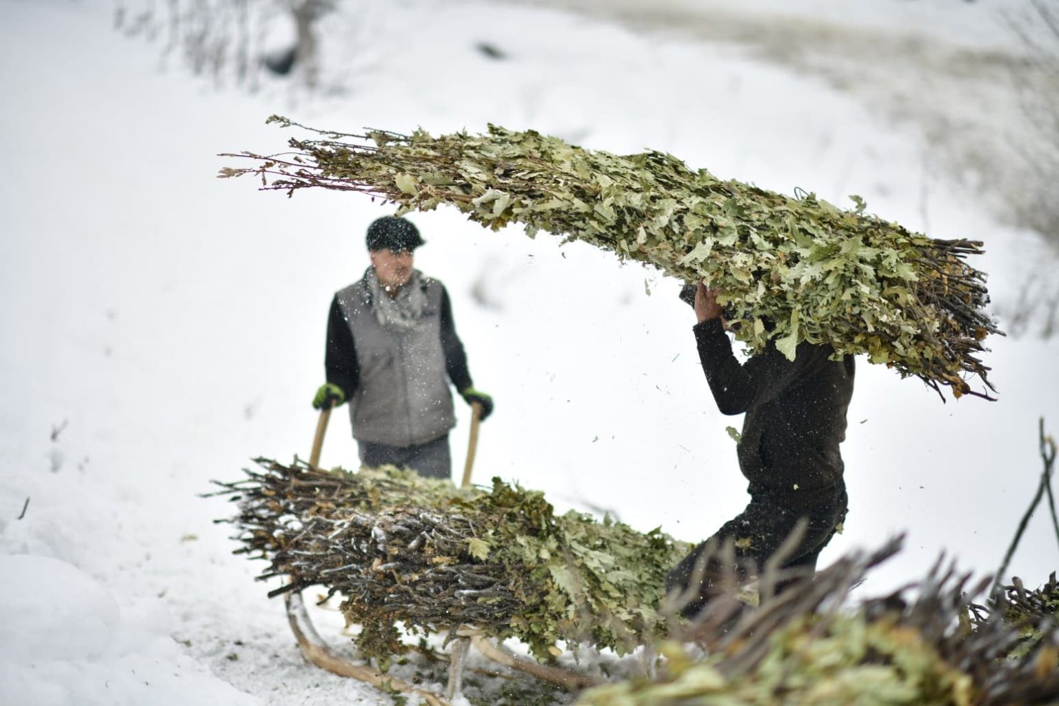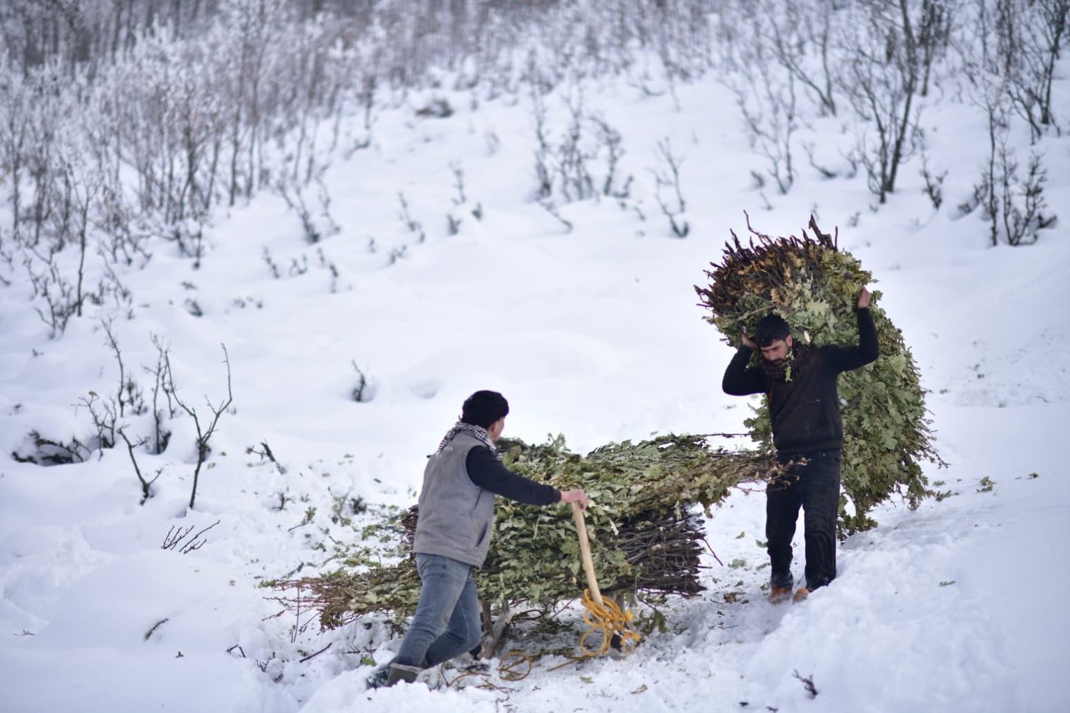 Karabey köyünde besicilik yapan Servan Akar, yaz aylarında topladıkları meşe yapraklarını kış aylarında kızaklarla taşıyarak havanların olduğu bölgeye ulaştırdıklarını söyleyerek, “Biz burada aile olarak hayvancılık yapıyoruz. Yaz aylarında topladığımız meşe yapraklarını şimdi kızaklarla taşıyoruz ve hayvanlara yem olarak veriyoruz. Günde iki kere tepeye tırmanıyoruz, oradan da günde iki sefer kızakla yük getiriyoruz. Tabii zor oluyor. Bazen kızağın altında kalıyoruz, bazen devriliyor. Kızaklarla getirdiğimiz yaprakları burada hayvanlara veriyoruz. Bu şekilde hayvanları besliyoruz ama gerçekten çok zor. Hayvancılık zaten zor bir meslek. Kış da çetin geçiyor; kar çok, hava çok soğuk. Ama mecburuz, beslemek zorundayız. Başka yapacak bir şey yok. Yazın yol olmadığı için traktör çıkamıyor, araziler dik yamaçlı. Biz de yazın yaprakları toplayıp, kışın kızaklarla çekerek hayvanlarımızı bu şekilde besliyoruz” dedi.