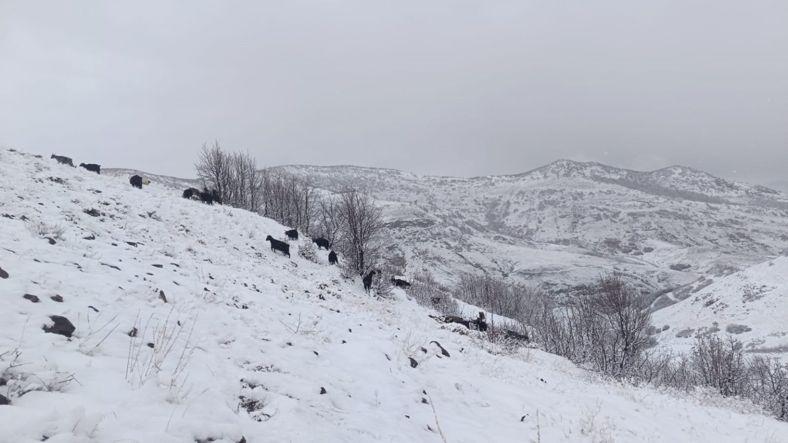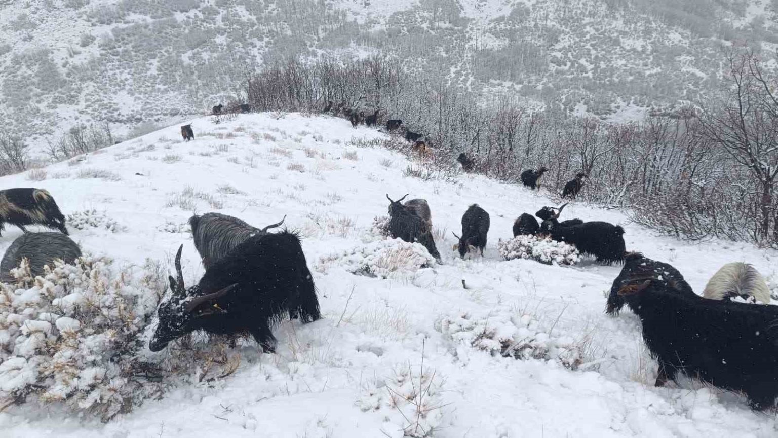 Muş’un Karabey köyüne bağlı Kamiş mezrasında hayvanlarını dağda otlatan çobanlar, aniden bastıran kar yağışı nedeniyle zor anlar yaşadı. Yüksek kesimlerde etkisini gösteren yağış dolayısıyla görüş mesafesi düşerken, çobanlar keçi sürülerini köye indirmek için uzun süre mücadele etti. Zorlu hava şartları nedeniyle sürüler yer yer ilerlemekte zorlandı.