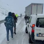Karayolları ekipleri, yolu yeniden ulaşıma açmak için kar küreme ve tuzlama çalışmalarını aralıksız sürdürüyor. Trafik ekipleri ise sürücülere zincir, çekme halatı ve takoz bulundurmaları, hız yapmamaları ve takip mesafesini korumaları konusunda uyarılarda bulundu.