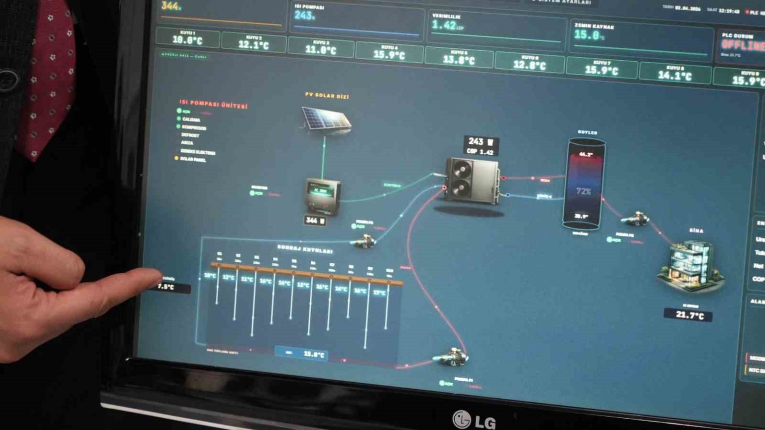 Sisteme entegre edilen güneş enerjisi altyapısının da enerji bağımsızlığını artırdığı ifade edilirken, yaklaşık bin metrekare alana kurulabilen 200 kilowatt-peak (kWp) gücündeki fotovoltaik sistemin Türkiye koşullarında yıllık ortalama 280-320 megavat-saat (MWh) elektrik üretimi sağlayabildiği belirtiliyor. Üretilen enerjinin ısı pompası, sirkülasyon pompaları ve otomasyon sistemlerinin önemli bir kısmını karşılayarak işletme maliyetlerini ciddi ölçüde düşürdüğünün altı çizilirken, ayrıca sisteme dahil edilen batarya depolama ünitesi sayesinde enerji üretimindeki dalgalanmalar dengelenerek kesintisiz çalışma ve operasyonel güvenliğin sağlandığı ifade edildi.