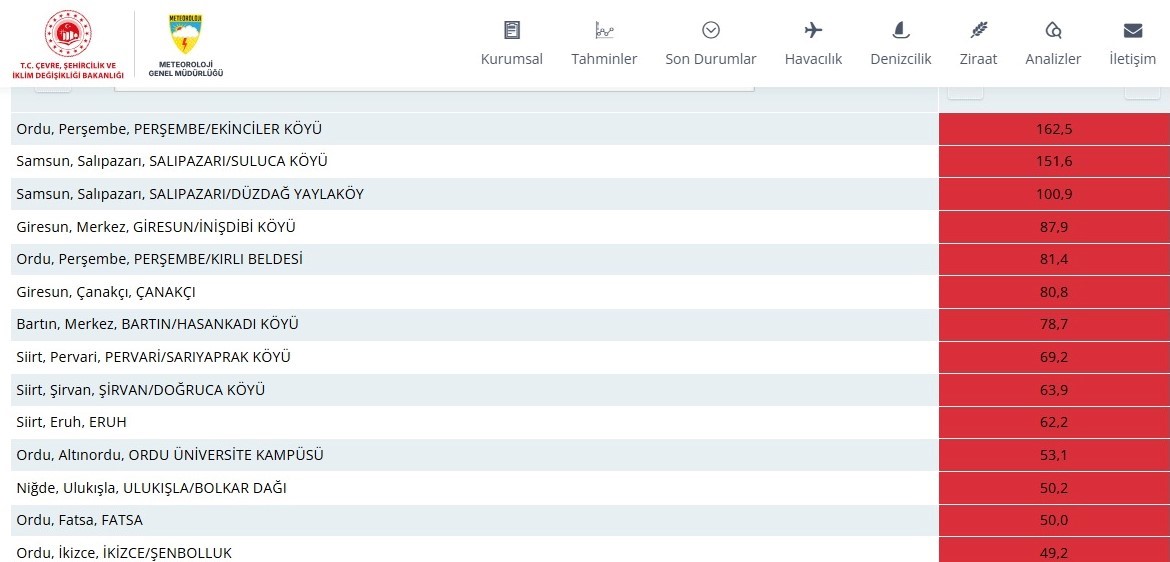 Meteoroloji Genel Müdürlüğü verilerine göre Ordu’nun Perşembe ilçesi Ekinciler Mahallesi, gün içerisinde aldığı 162,5 mm yağış ile Türkiye’de en çok yağış alan bölge oldu.