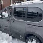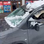 Bitlis’te park halindeki bir aracın üzerine çatıda biriken kar kütlesi düştü.