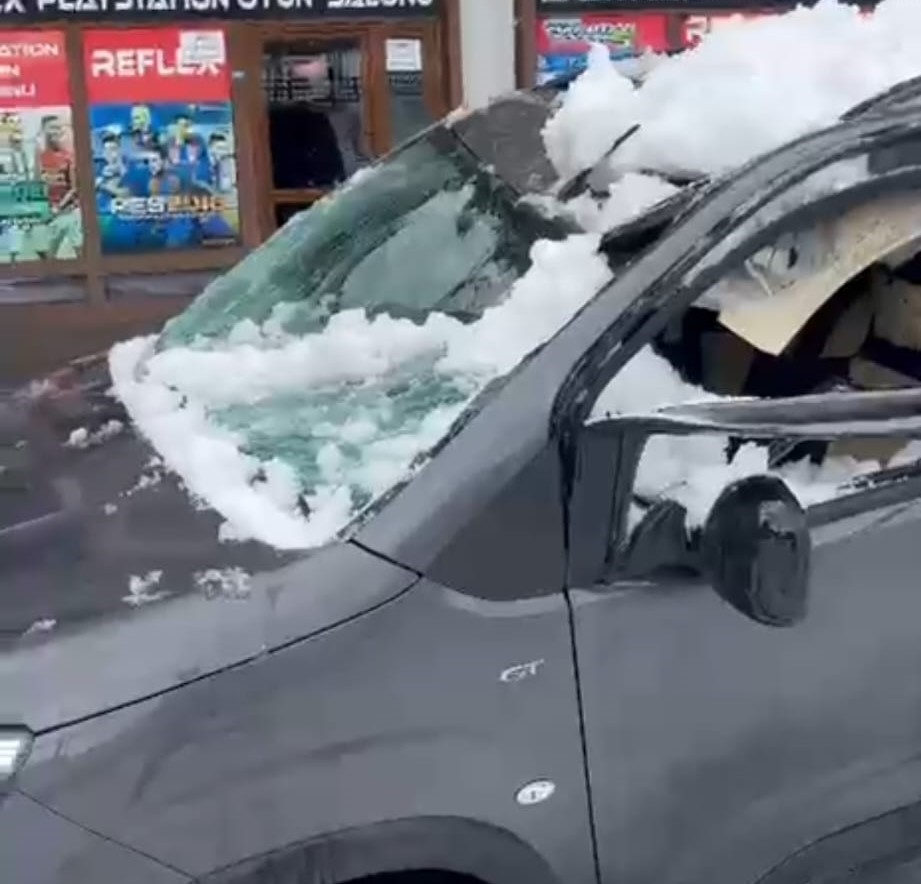 Park halindeki aracın üzerine çatıdan kar kütlesi düştü