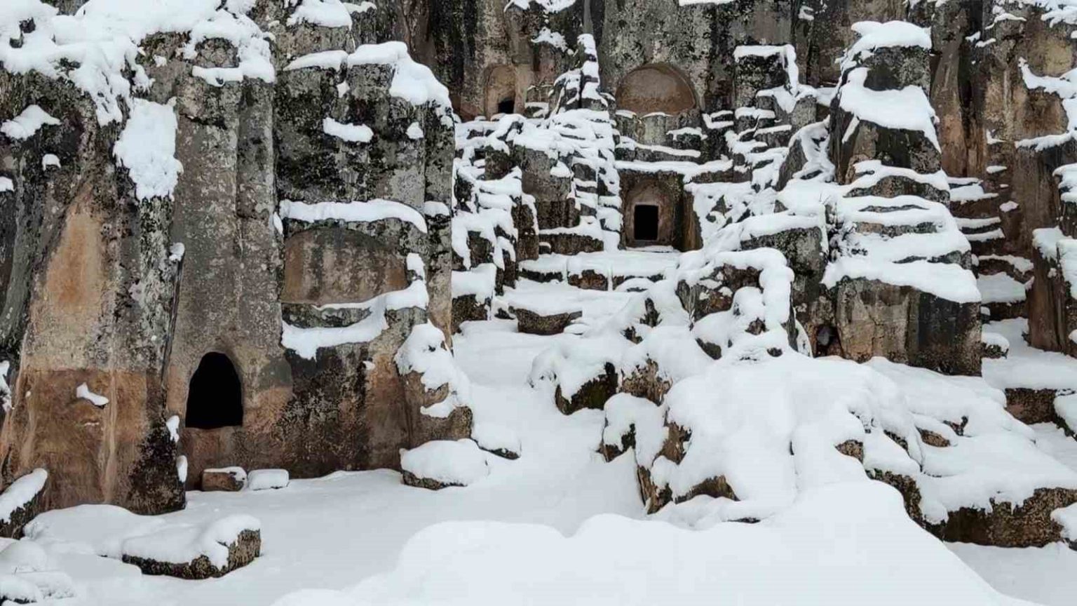 Perre Antik Kenti’nin kayalara oyulu mezar yapıları, tarihi taş yolları ve kalıntıları karla birlikte daha da dikkat çekici hale geldi.