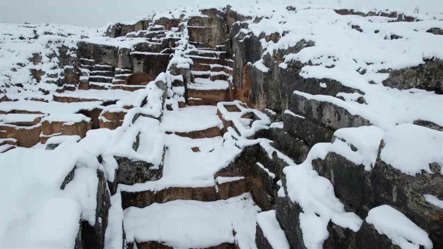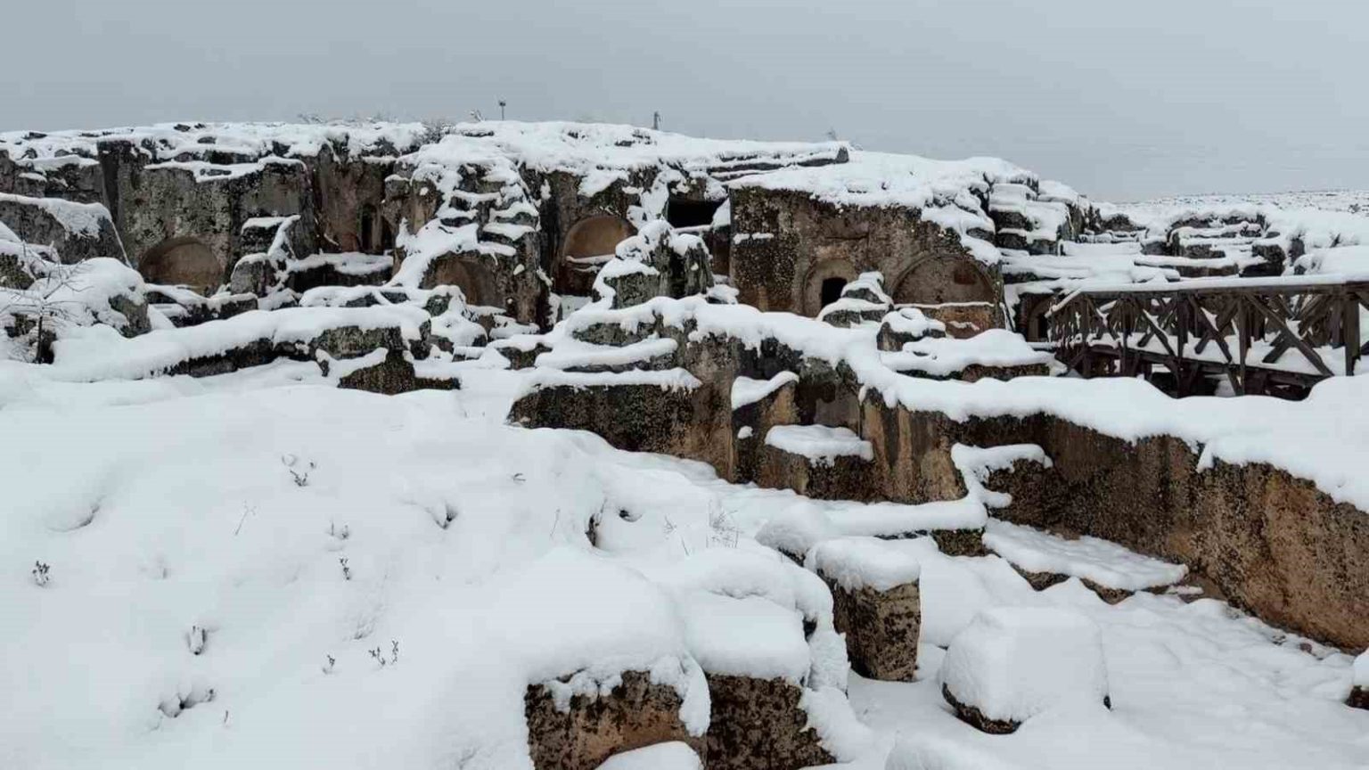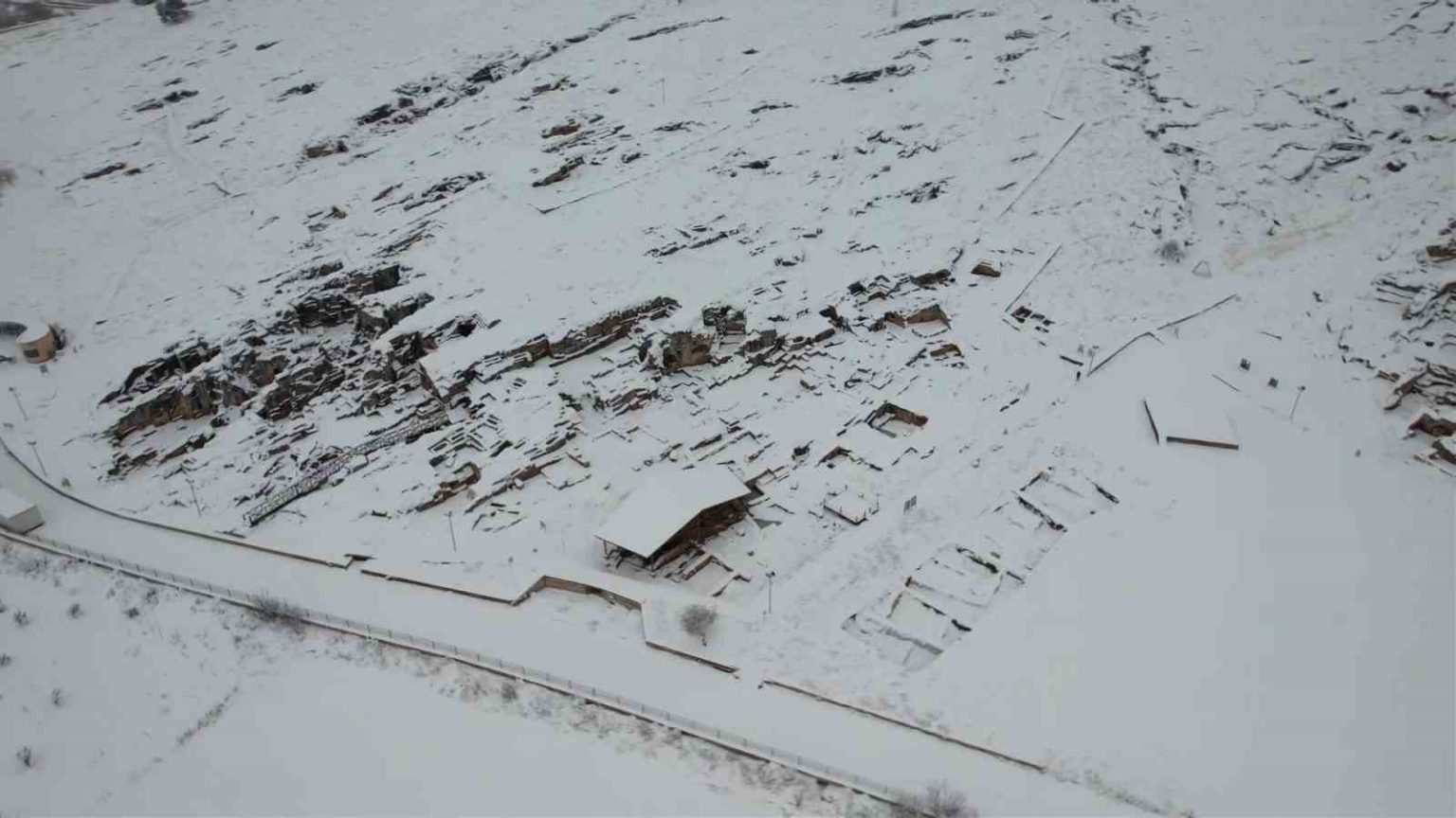 Antik kent çevresinde oluşan beyaz manzara, tarihle doğanın buluştuğu eşsiz bir görüntü oluşturdu.