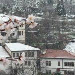 Karabük’ün Safranbolu ilçesinde kar yağışıyla çatıları beyaza bürünen tarihi yapıların çiçek açan ağaçlarla oluşturduğu manzara mest etti.