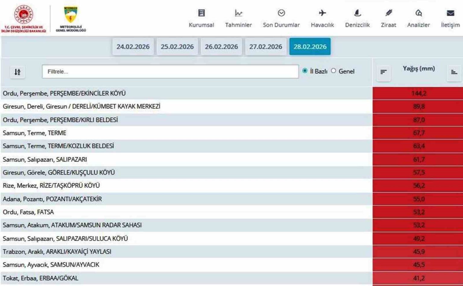 MGM’nin 27 Şubat Cuma saat 06.00 ile 28 Şubat Cumartesi günü saat 06.00 saatleri arasındaki verilere göre Atakum’a 53,2 kilo, Ayvacık’a 45,5 kilo ve Çarşamba’ya da 40 kilo yağış düşerek ortalamanın üzerinde seyretti.
