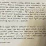 Çukurova Belediyesi teknik ekiplerinin başvuru üzerine yaptığı yerinde inceleme sonrası 3 Mart 2025 tarihinde hazırlanan raporda, yapıdaki tadilatın yapının statiğini bozacak nitelikte olduğu belirtildi. Ayrıca mevcut binanın bitişiğinde yaklaşık 12×6 metre ebatlarında betonarme temel atıldığı ve kolon filizlerinin bırakıldığının tespit edildiği bildirildi. Bu nedenle belediye işlemlerin 3194 sayılı İmar Kanunu’nun 32. maddesi kapsamında ruhsata aykırı olduğunu belirterek, yapı tatil zaptı düzenleyip inşaatı mühürledi.