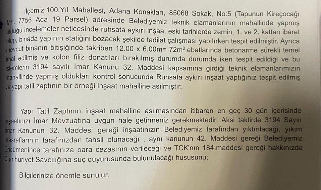 Çukurova Belediyesi teknik ekiplerinin başvuru üzerine yaptığı yerinde inceleme sonrası 3 Mart 2025 tarihinde hazırlanan raporda, yapıdaki tadilatın yapının statiğini bozacak nitelikte olduğu belirtildi. Ayrıca mevcut binanın bitişiğinde yaklaşık 12×6 metre ebatlarında betonarme temel atıldığı ve kolon filizlerinin bırakıldığının tespit edildiği bildirildi. Bu nedenle belediye işlemlerin 3194 sayılı İmar Kanunu’nun 32. maddesi kapsamında ruhsata aykırı olduğunu belirterek, yapı tatil zaptı düzenleyip inşaatı mühürledi.