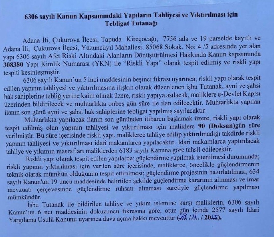 Çukurova Belediyesi’nin bu kararı alması üzerine Seyhan Belediyesi İmardan Sorumlu Belediye Başkan Yardımcısı İnci Makal, binanın depreme dayanıksız olduğunu belirterek, bu durumun tespit edilmesi için Adana Çevre, Şehircilik ve İklim Değişikliği İl Müdürlüğüne başvuru yaptı. Yapılan başvuru üzerine müdürlük incelemesini tamamlayıp 28 Kasım 2025’te yapı 6306 sayılı Kanun kapsamında riskli yapı olarak değerlendirildi ve yıkım kararı verildi. İtiraz üzerine üniversite ve bakanlık temsilcilerinden oluşan teknik heyetin yaptığı incelemede de riskli yapı tespiti kesinleşti. Her iki taraf da birbirinden şikayetçi olduğu için konu mahkemeye taşındı.