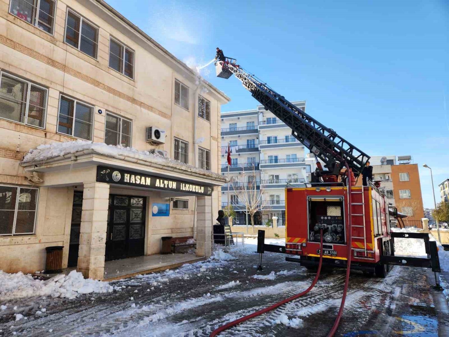 Siirt Belediyesi İtfaiye Müdürlüğü ekipleri, yaya ve araç trafiğinin yoğun olduğu cadde ve sokakların yanı sıra okul binaları başta olmak üzere kamu kurumlarında da önlem aldı. Çatılarda ve saçaklarda biriken kar kütleleri, merdivenli itfaiye araçları kullanılarak kontrollü şekilde temizleniyor.