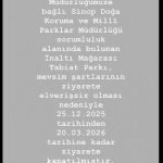 Yapılan açıklamada, ziyaretçilerin güvenliğinin sağlanması amacıyla alınan karar doğrultusunda tabiat parkının 25 Aralık 2025 ile 20 Mart 2026 tarihleri arasında ziyaret edilemeyeceği bildirildi. Yetkililer, hava ve arazi koşullarının uygun hale gelmesinin ardından İnaltı Mağarası Tabiat Parkı’nın yeniden ziyaretçilere açılacağını belirtti.