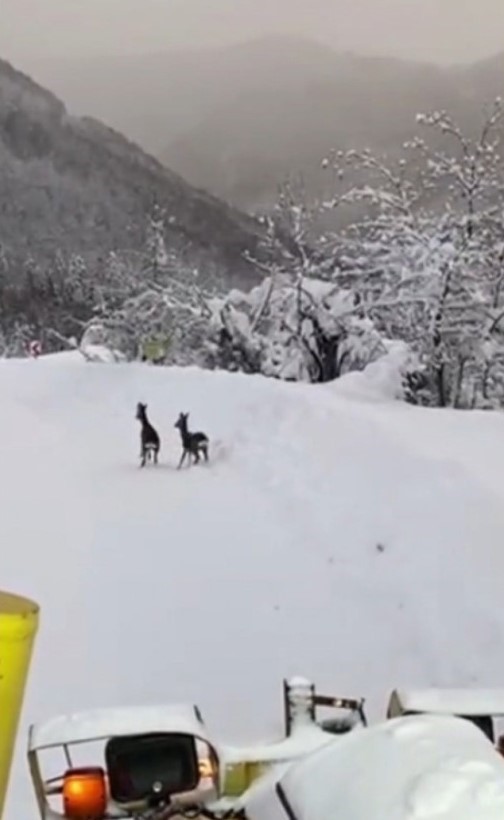 Ekipler, kar kalınlığının yer yer 1 metreye ulaştığı bölgede iş makineleriyle yol açtığı sırada sürpriz misafirlerle karşılaştı. Ormanlık alandan yola çıkan karacalar, metrelerce karın içerisinde adeta birbirleriyle yarışarak koşmaya başladı. Karacaların kar üzerindeki sevinç dolu anları, çalışmaları sürdüren personeller tarafından saniye saniye kaydedildi.