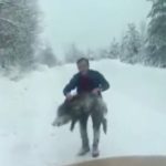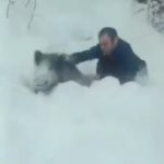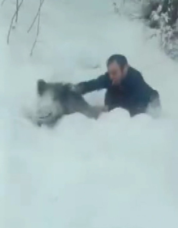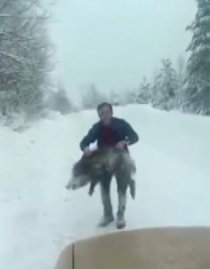 Sinop’un Erfelek ilçesinde karlı yolda ilerleyen bir araç yaban domuzu sürüsü ile karşı karşıya geldi. Araçtan inip yaban domuzunu kovalayan bir vatandaş hayvanı eliyle yakalayıp geri bıraktı. O anlar telefon kamerasına yansıdı.