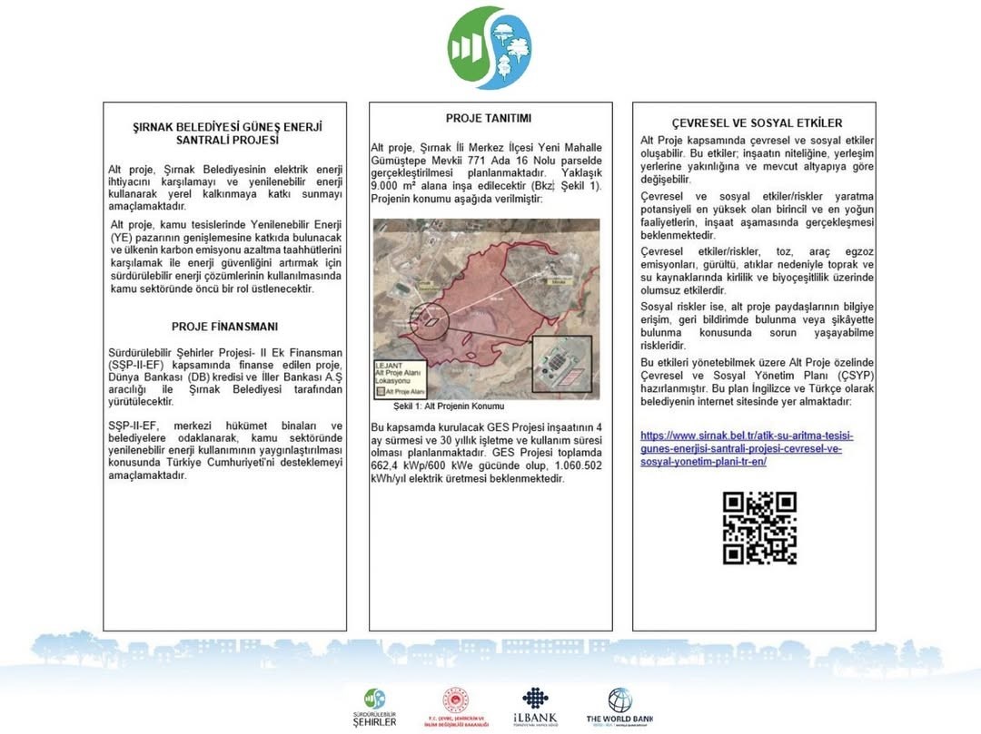 Şırnak Belediyesi, Dünya Bankası destekli Güneş Enerji Santrali (GES) projesiyle atıksu arıtma tesisinin elektrik ihtiyacını güneşten karşılamaya hazırlanıyor. Yılda 1 milyon kilovatsaatten fazla elektrik üretecek proje sayesinde hem çevre korunacak hem de belediyenin enerji maliyetleri önemli ölçüde azalacak.