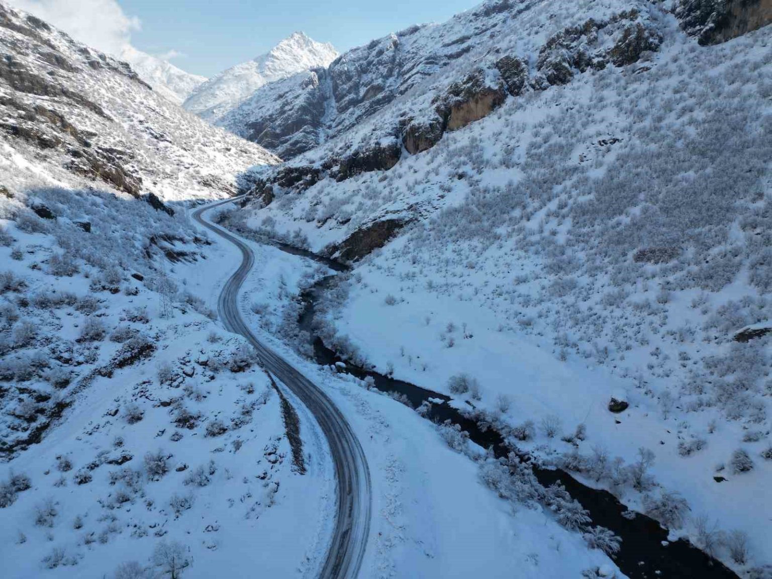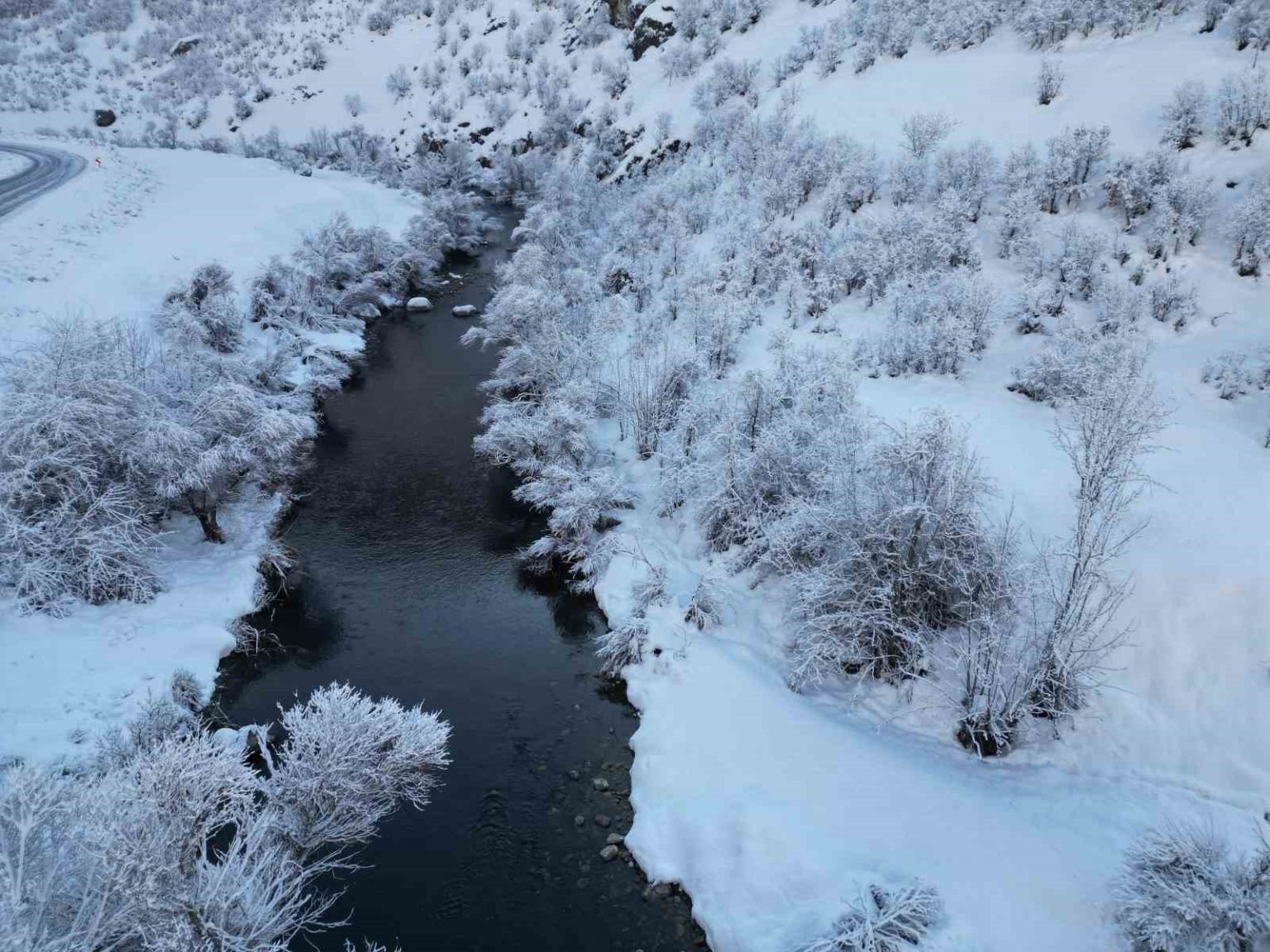Şırnak’ın Beytüşşebap ilçesinden geçen Yeşilöz deresi çevresinde kar yağışı sonrası görsel şölen oluştu. Mağara, dere yatağı ve ağaçların beyazlar içinde kaldığı bölgeler göz kamaştırdı. Beyazın güzelliğini yansıdığı görüntüler dronla kaydedildi.