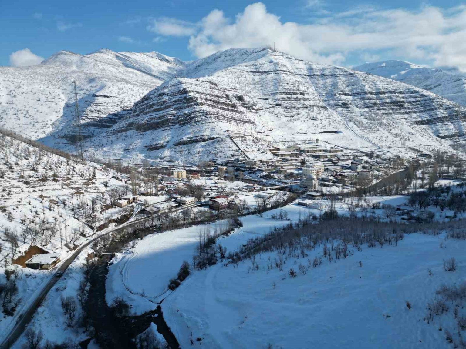 Beytüşşebap ilçesinde kar yağışı sonrası oluşan dondurucu soğuklar, buzlanmayı da beraberinde getirdi. Meşe ormanlarının ve evlerin adeta karda kaybolduğu ilçede dereler de buz tuttu. Hava sıcaklığının gece eksi 14 dereceye kadar düştüğü bölge havadan görüntülenirken, kartpostallık görüntüler ortaya çıktı.