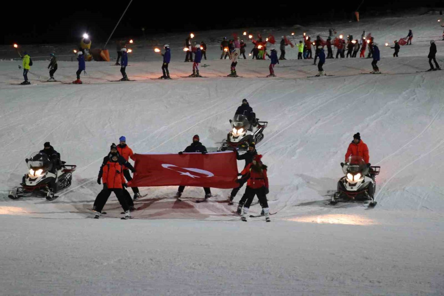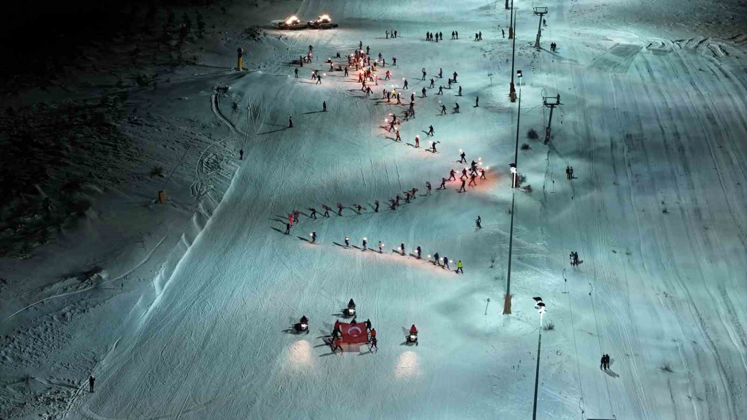 Sivas Yıldız Dağı Kış Sporları Turizm Merkezi’nde resmi sezon açılışı, kar üzerinde oynanan halaylar ve gece kayağı ile başladı.