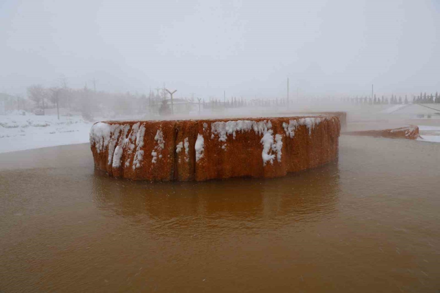 Sivas’ın Altınkale Travertenleri, yağan kar ile eşsiz görüntüler oluşturdu
