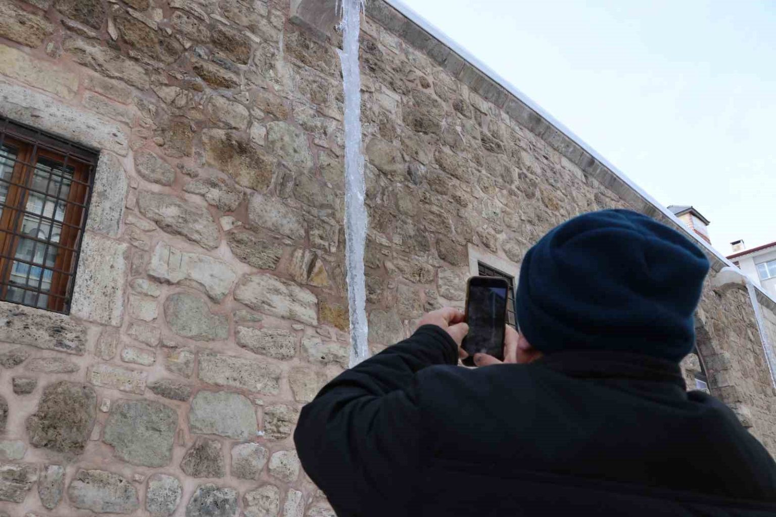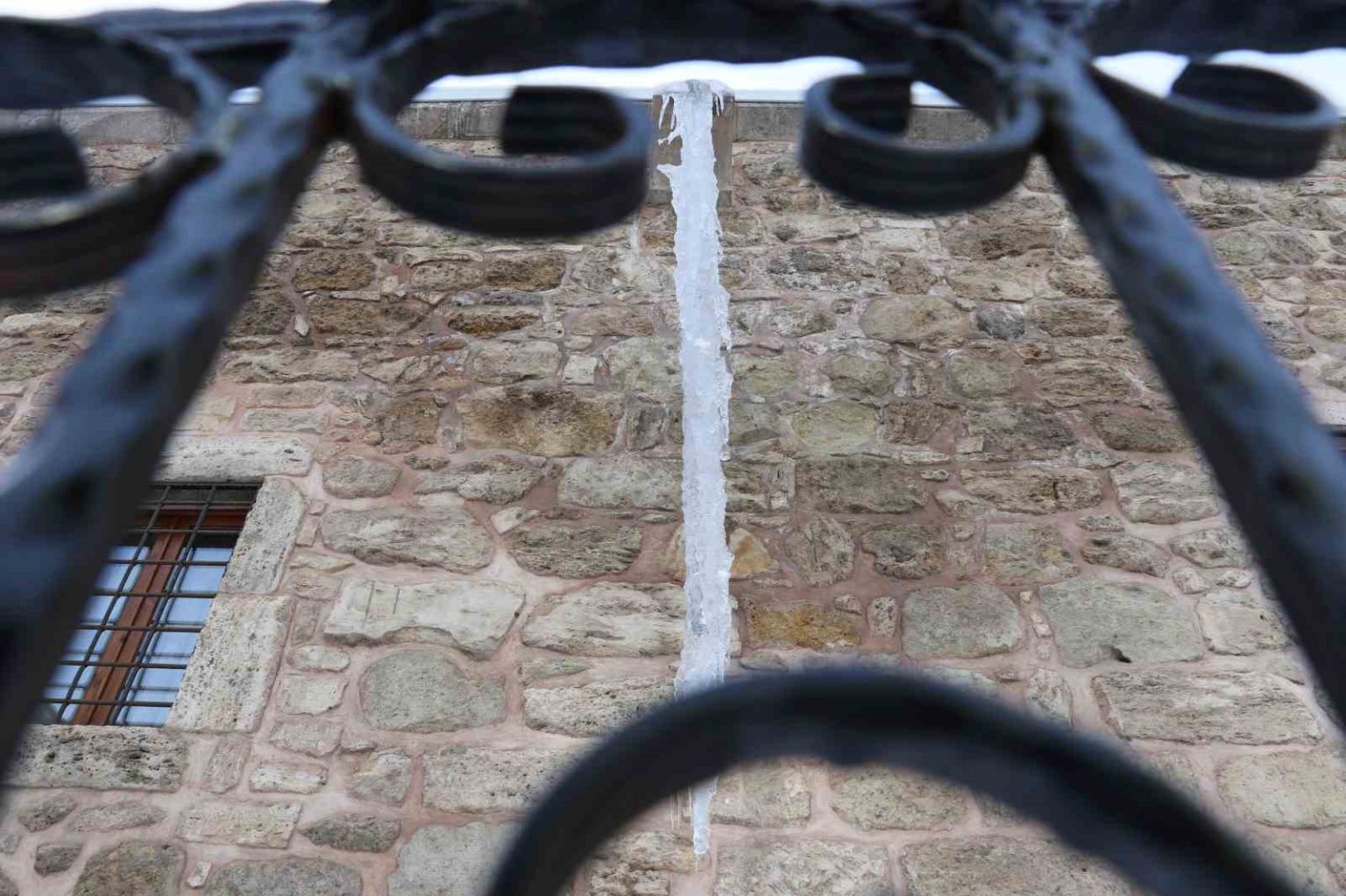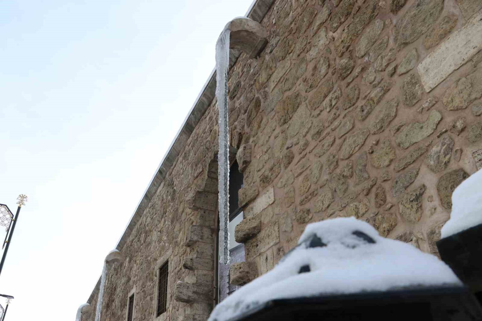Sivas’ta dondurucu soğuklar nedeniyle Behrampaşa Hanı’nın duvarlarında 4 metre uzunluğunda buz sarkıtları oluştu.