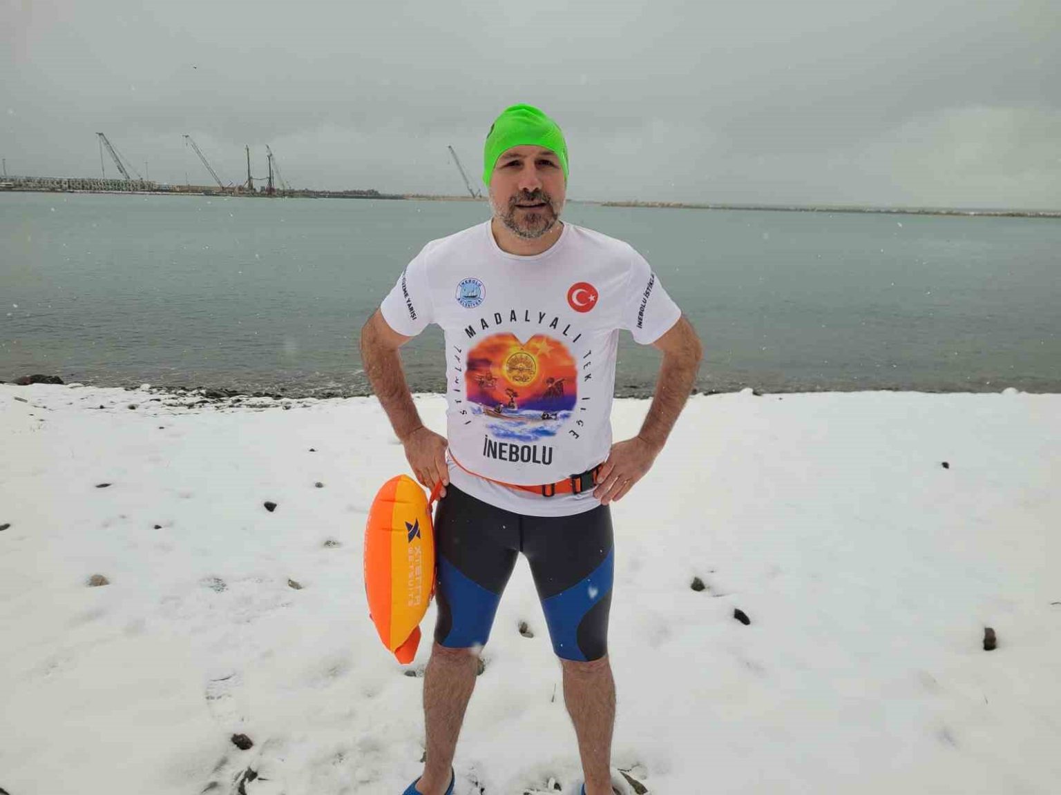 Soğuk havanın etkili olduğu günlerde denize girdiğini ifade eden Gürel, “Bu karlı günü kaçırmak istemedik. İnebolu’da yıllar sonra güzel bir kar yağdı. Şu anda şehir merkezi bile beyaz örtüyle kaplandı. ’Denizden kar yağarsa doldurur’ diye tabir vardır. Bizde de denizden yağdı, doldurdu. Bütün İnebolu karlı, bizler de bu karlı havada denize girmesek olmazdı. Ben, açık deniz yüzücüsüyüm. Kış aylarında da yüzüyoruz. Şu anda hava sıcaklığı 1 derece gibi, deniz suyu ise 6-8 derece civarında. Bizler yaz kış denize giriyoruz. Soğuk suyunda şifa olduğuna inanıyoruz. İnebolu, İstiklal madalyalı tek ilçedir. Şehit Şerife Bacı’nın torunları oluyoruz. Şehit Şerife Bacı ve atalarımız, kar kış demeden İnebolu’dan cephaneleri Kurtuluş Savaşı’nda kağnılarla taşıdılar. O büyük mücadeleyi verdiler, Allah hepsinden razı olsun. Bizler de dayanıklılığımızı göstereceğiz. Bu suya gireceğiz” dedi.