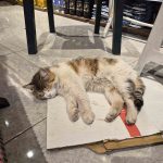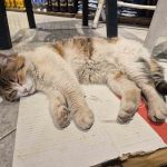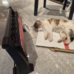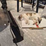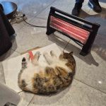 Eskişehir’de soğuktan üşüyen bir sokak kedisi, ısınmak için sığındığı bakkal dükkanında elektrikli ısıtıcının karşısına geçip uyudu.