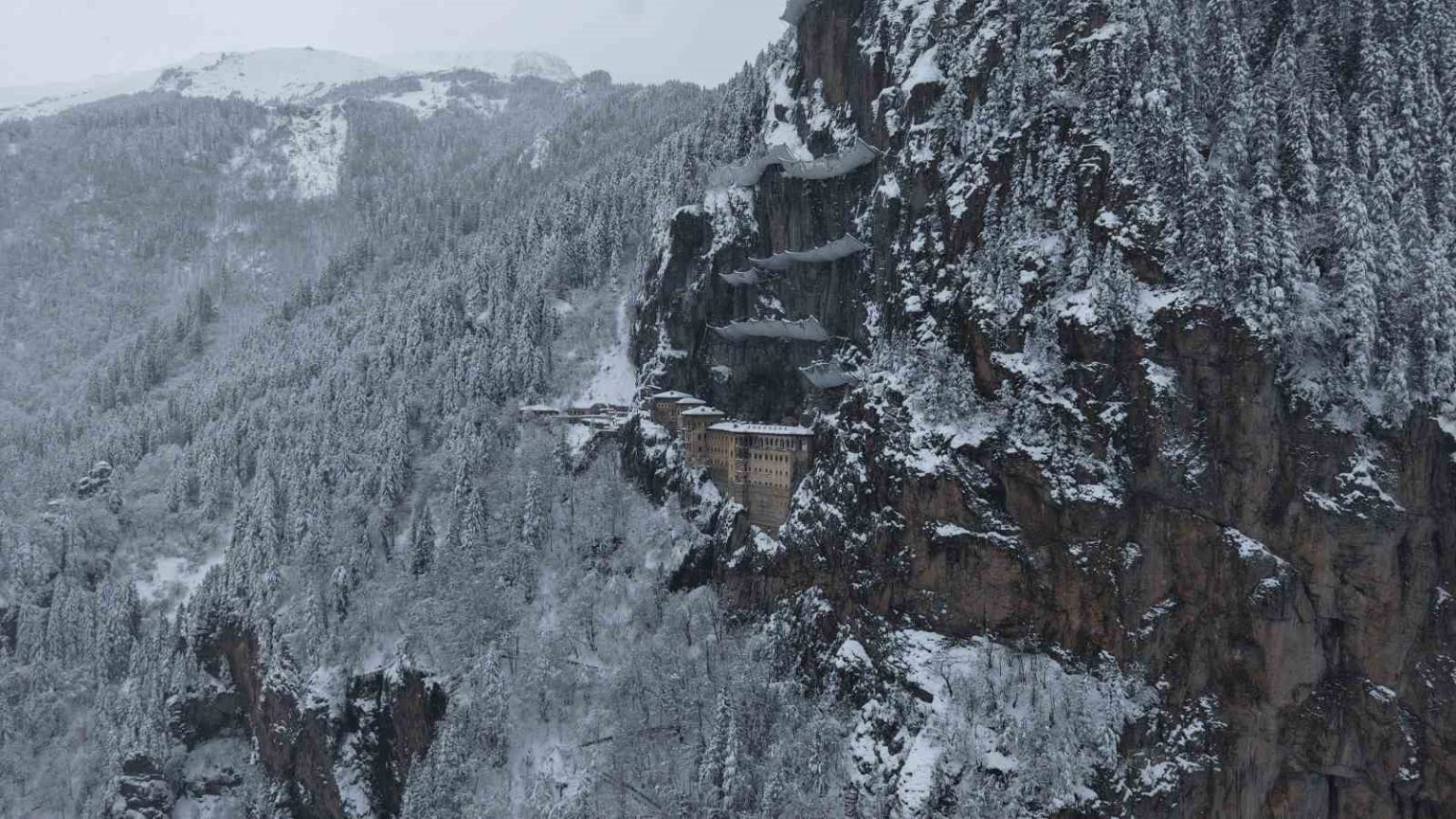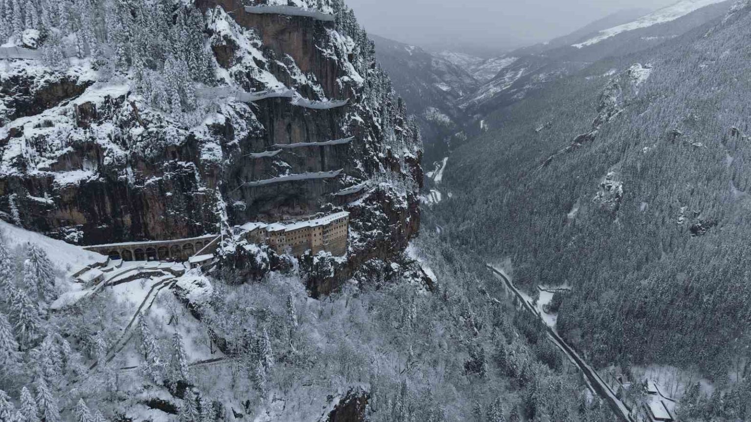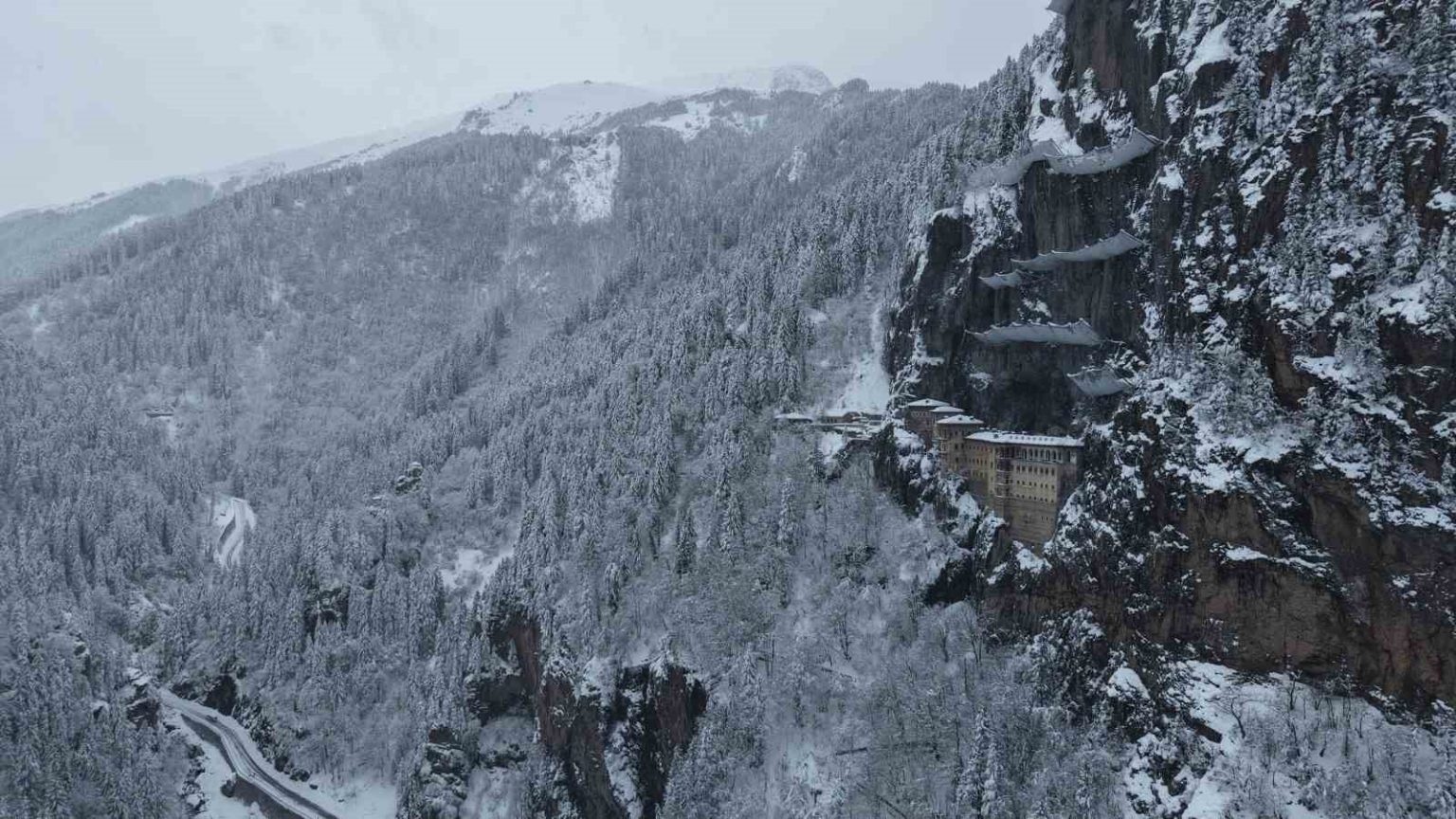 Türkiye’nin önemli inanç ve kültür turizmi merkezlerinden biri olan Sümela Manastırı ve çevresi, kar yağışıyla beyaza büründü. Altındere Vadisi’nin doğal dokusu ve tarihi manastırın atmosferi, kar manzarasıyla birleşince ortaya etkileyici görüntüler çıktı.
