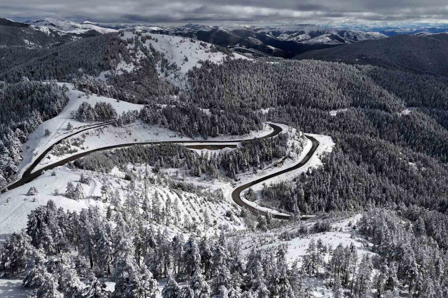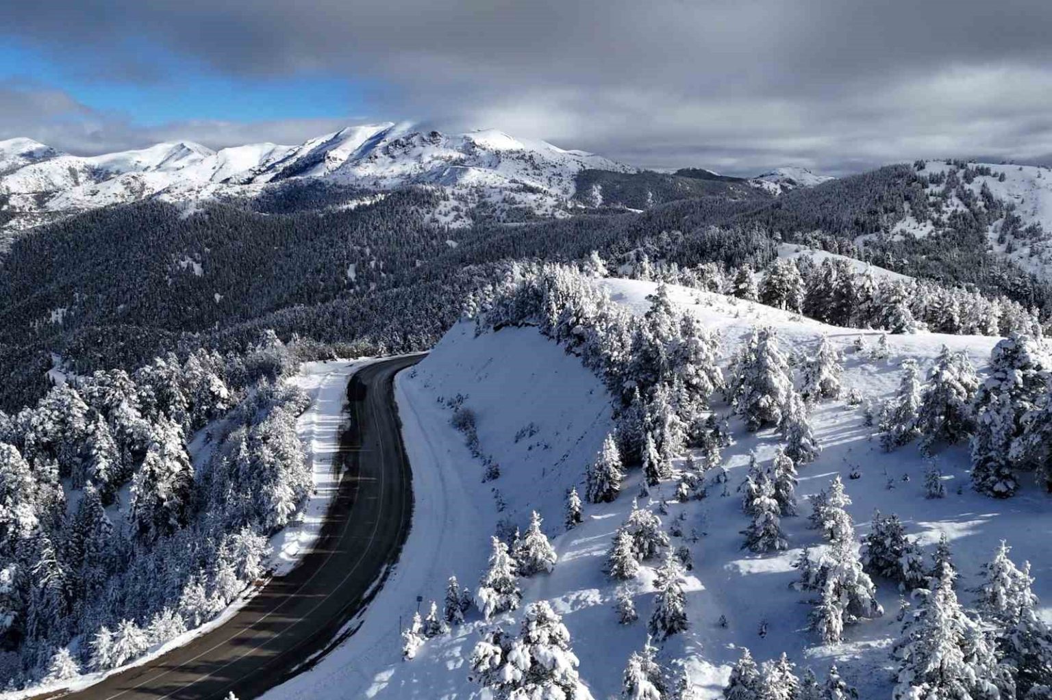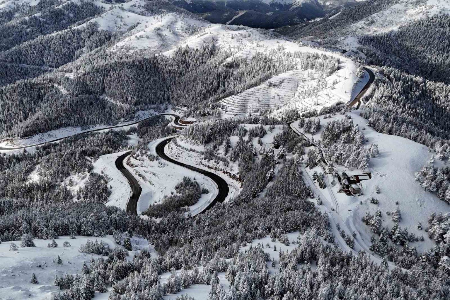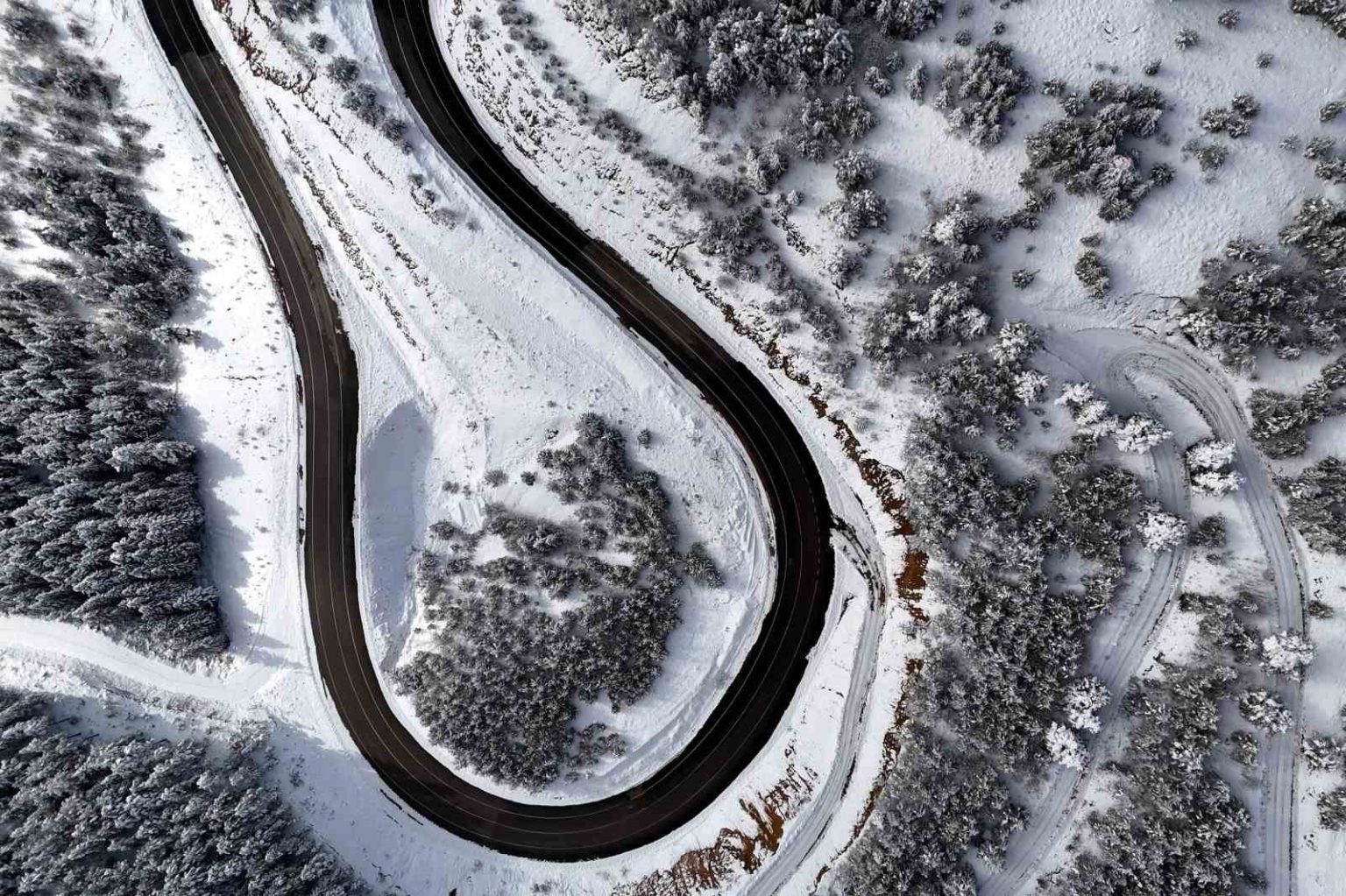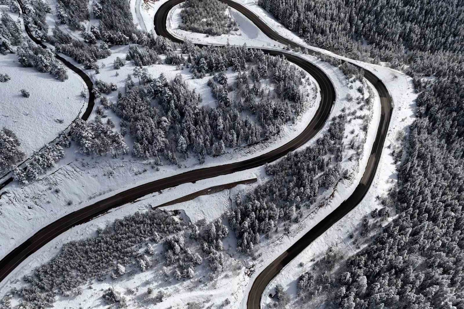 Gümüşhane-Şiran arasındaki en kısa güzergah olan 2 bin rakımlı Tersun Dağı Geçidi, etkili olan kar yağışının ardından kartpostallık görüntülere sahne oldu. Kıvrım kıvrım yolları ve dik rampalarıyla sürücülerin ’korkulu rüyası’ olan geçitte, karın oluşturduğu eşsiz manzara havadan görüntülendi.