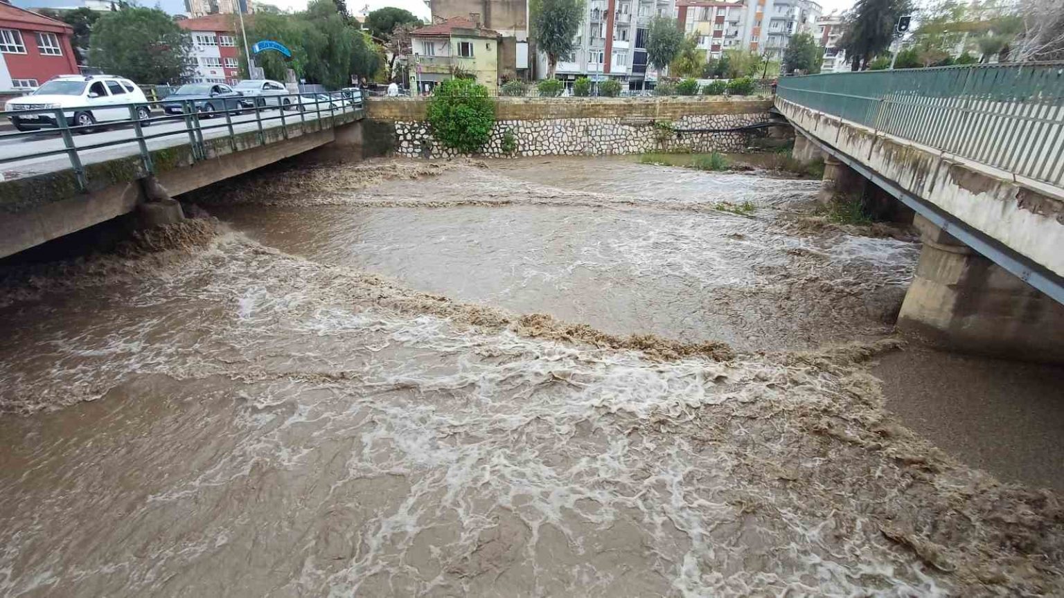 Aydın’ın merkez ilçesi Efeler’de etkili olan sağanak yağışın ardından yağmur suları Tabakhane Deresi’ni coştururken, derede su seviyesi yükseldi.