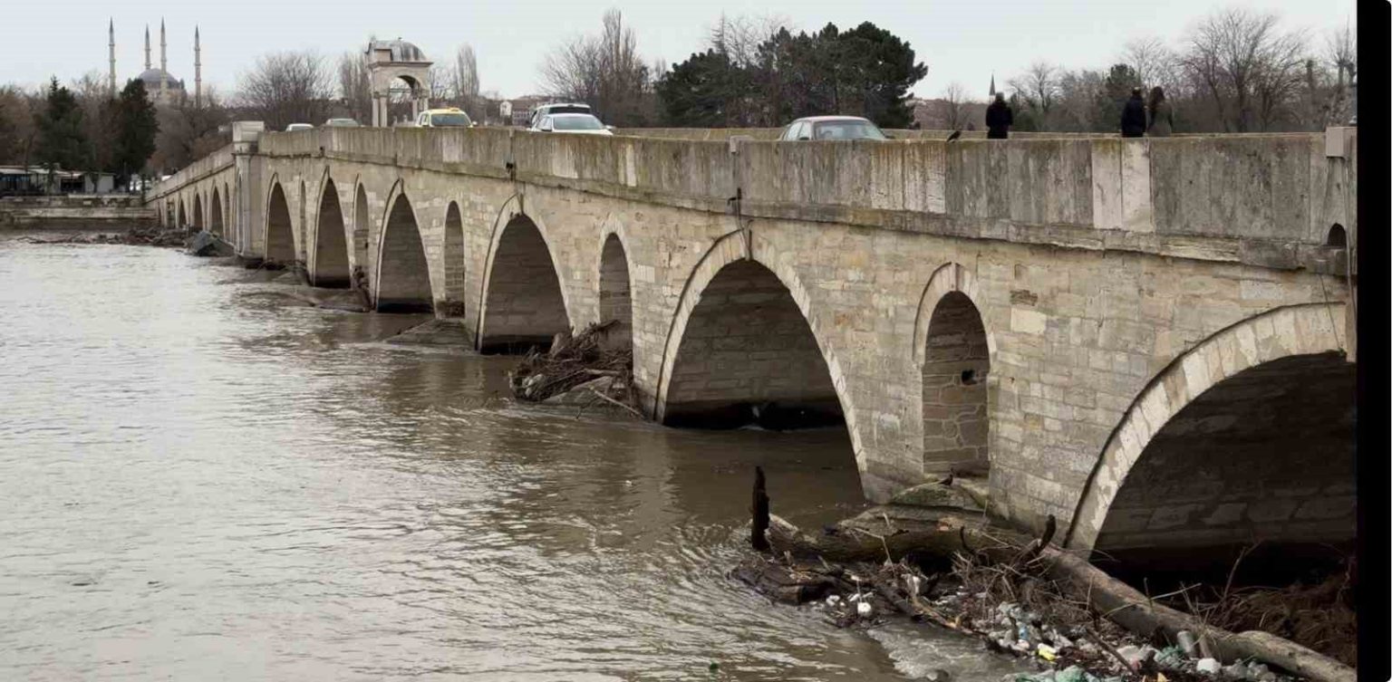 Nehrin üst havzasından sürüklenen ağaç gövdeleri, dev tomruklar ve evsel atıklar, kentin simgelerinden tarihi Meriç Köprüsü’nün kemerlerinde birikti. Suyun yüzeyini kaplayan plastik şişe ve kirlilik tabakası, tarihi köprünün ayaklarında adeta bir set oluşturdu.