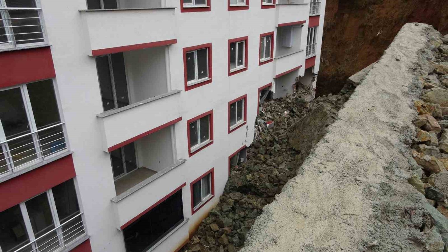 Trabzon’un Yomra ilçesinde sabah saatlerinde istinat duvarının çökmesi sonucu 9 katlı yeni bir binanın iki dairesinde hasar meydana geldi.