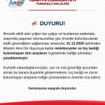 Tunceli Valiliği’nden yapılan uyarıda, “İlimizde etkili olan yoğun kar yağışı ve buzlanma nedeniyle, ulaşımda yaşanan olumsuzluklar göz önünde bulundurularak trafik güvenliğinin sağlanması amacıyla; 31.12.2025 tarihinden itibaren ikinci bir duyuruya kadar motokuryeler ve kış lastiği bulunmayan tüm araçların il genelinde trafiğe çıkmaları yasaklanmıştır. Kıymetli vatandaşlarımızdan, can ve mal güvenliği açısından alınan bu karara duyarlılık göstermelerini, kış lastiği ve zinciri bulunmayan araçlarla trafiğe çıkmamalarını önemle rica ederiz” denildi.