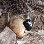 Üşüyen kedi ile köpek birbirine sığındı
