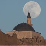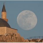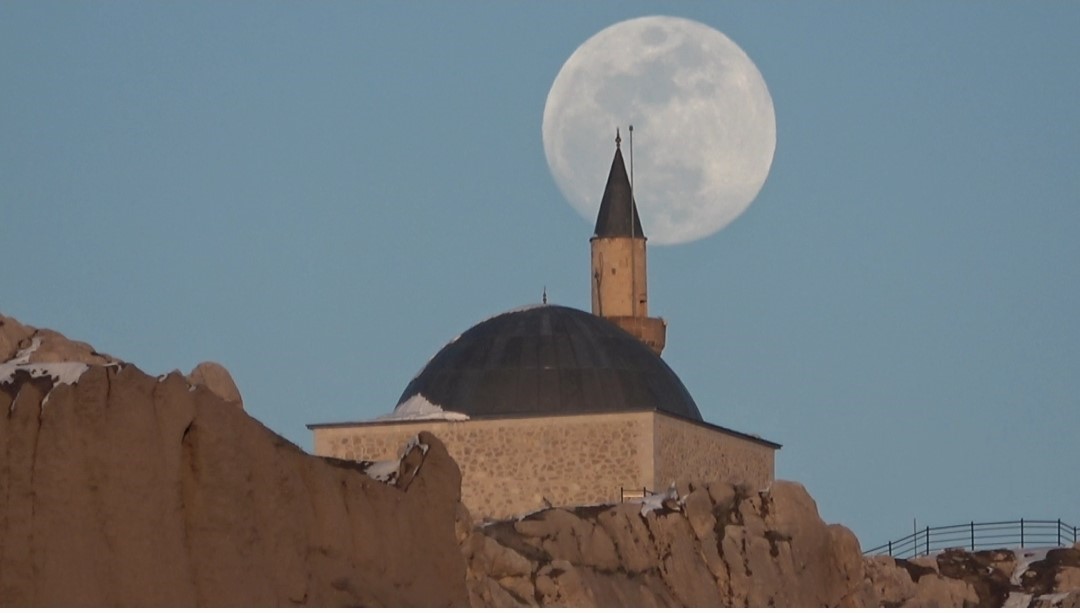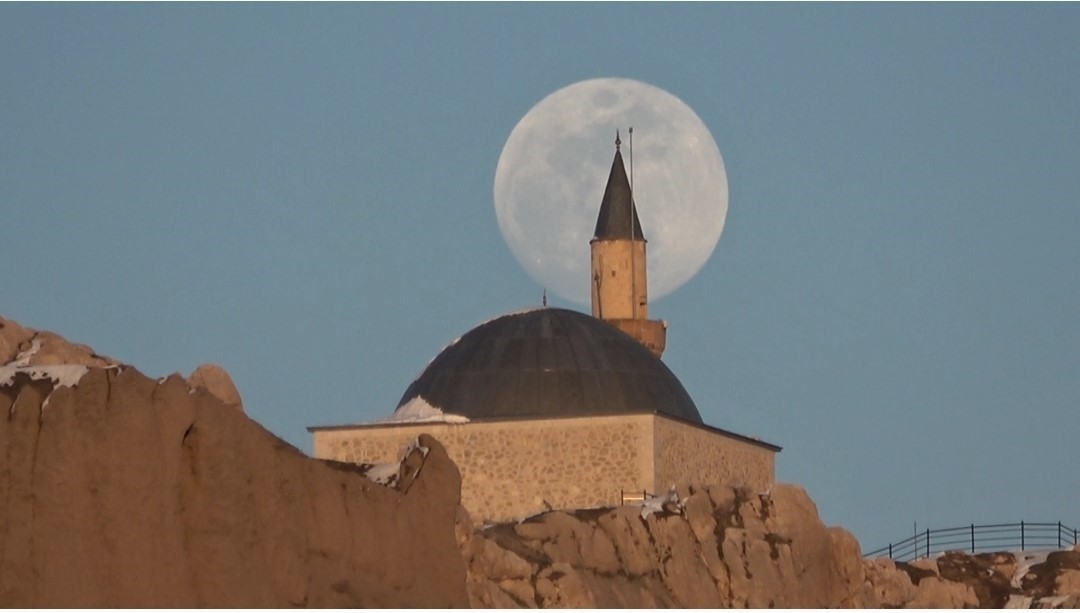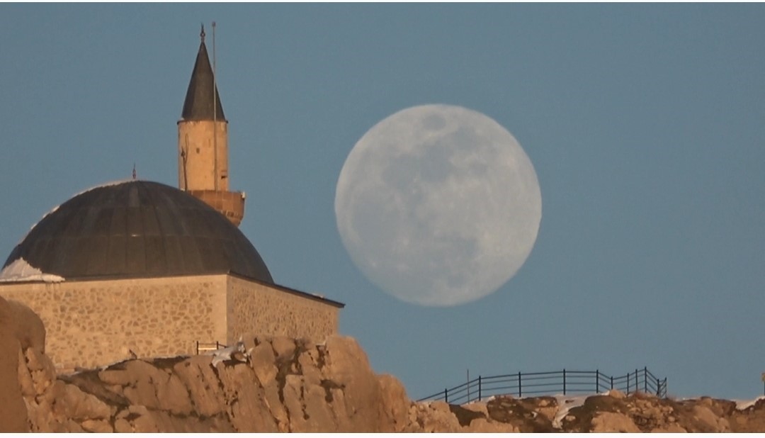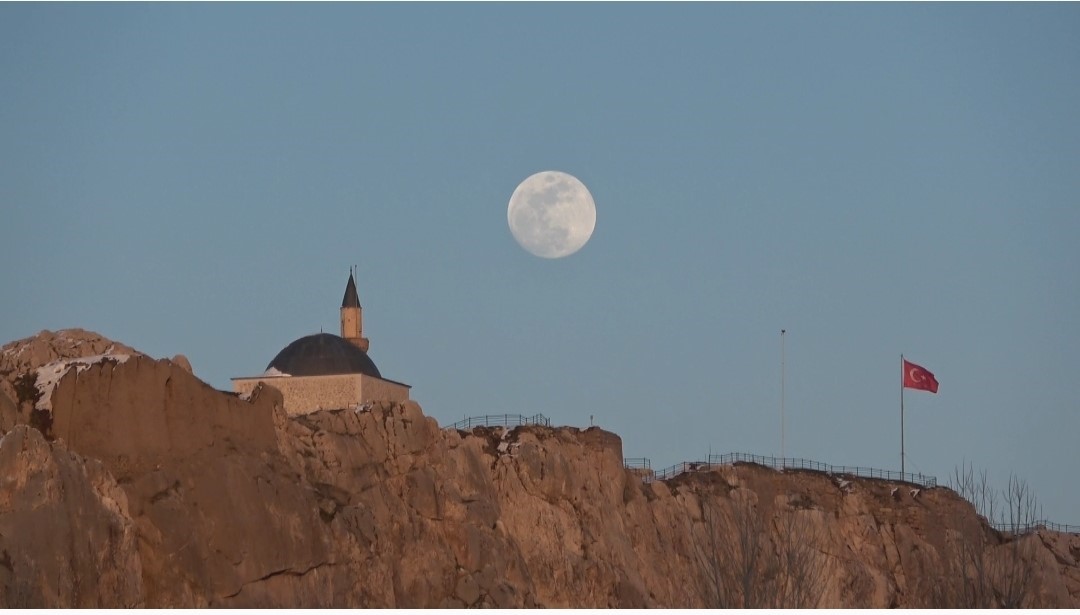 Türkiye’nin en doğusunda, güneşin en görkemli veda ettiği şehirlerden biri olan Van’da, bugün de gökyüzü nöbeti büyük bir zarafetle devredildi. Van Gölü’nün uçsuz bucaksız maviliği üzerinde batan güneş, yerini gecenin sultanı aya bıraktı. Güneşin ufuk çizgisinin altına inmesiyle birlikte, nöbeti devralan ay, Erek Dağı’nın üzerinden tüm heybetiyle yükseldi. Gökyüzünün derin maviliğinde parlayan ay, geceyi aydınlattı.