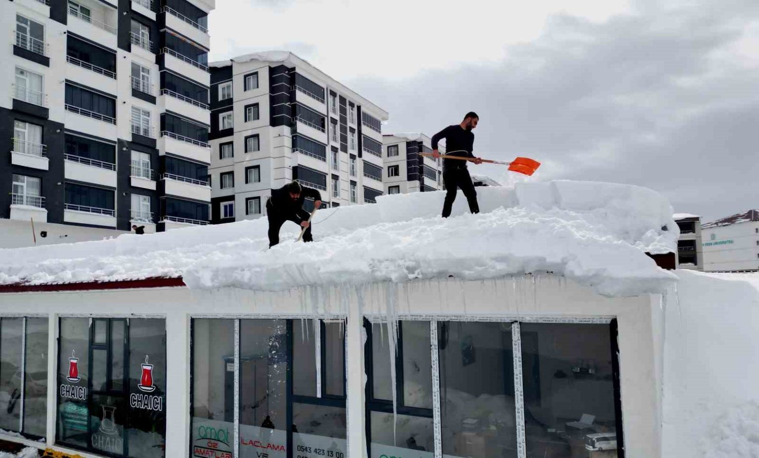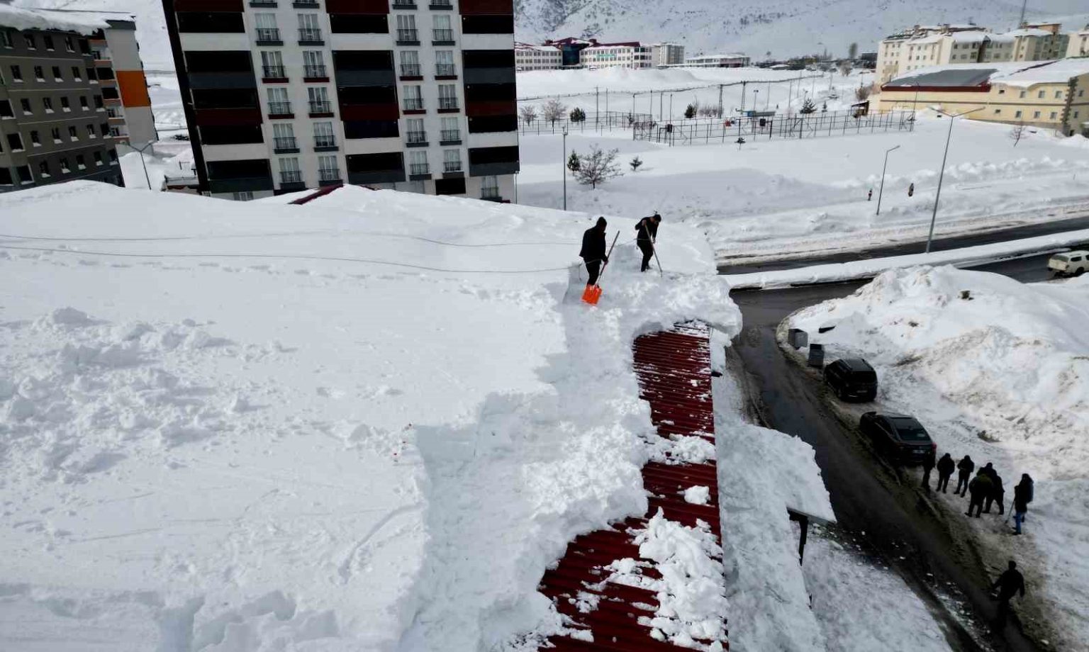 Kar yağışının durmasıyla birlikte esnaflar bir araya gelerek, vatandaşların can ve mal güvenliğini korumak amacıyla çatılarda kar temizliği çalışmalarına hız verdi. Kent merkezinde yer yer 2 metreye yaklaşan kar birikintileri, belediyeye ait iş makineleriyle temizlenirken, çatılarda biriken karlar da muhtemel tehlikelere karşı kontrollü şekilde indiriliyor. Özellikle son günlerde artan buzlanma riski nedeniyle çatılarda biriken karların can ve mal güvenliği açısından tehlike oluşturması üzerine esnaf ve bina sakinleri harekete geçti. Kar küreyicileri, bellerine bağladıkları emniyet ipleriyle güvenlik önlemleri alarak çatı üstlerinde biriken karları temizlemeye başladı. Esnaflar, çatılardaki karların temizlenmesiyle hem yapıların zarar görmesinin önüne geçtiklerini hem de yaya ve araç trafiği açısından oluşabilecek riskleri ortadan kaldırdıklarını ifade etti. Çatılardan indirilen karlar ise belediyeye ait iş makineleri tarafından toplanarak kent merkezinden uzaklaştırılıyor.