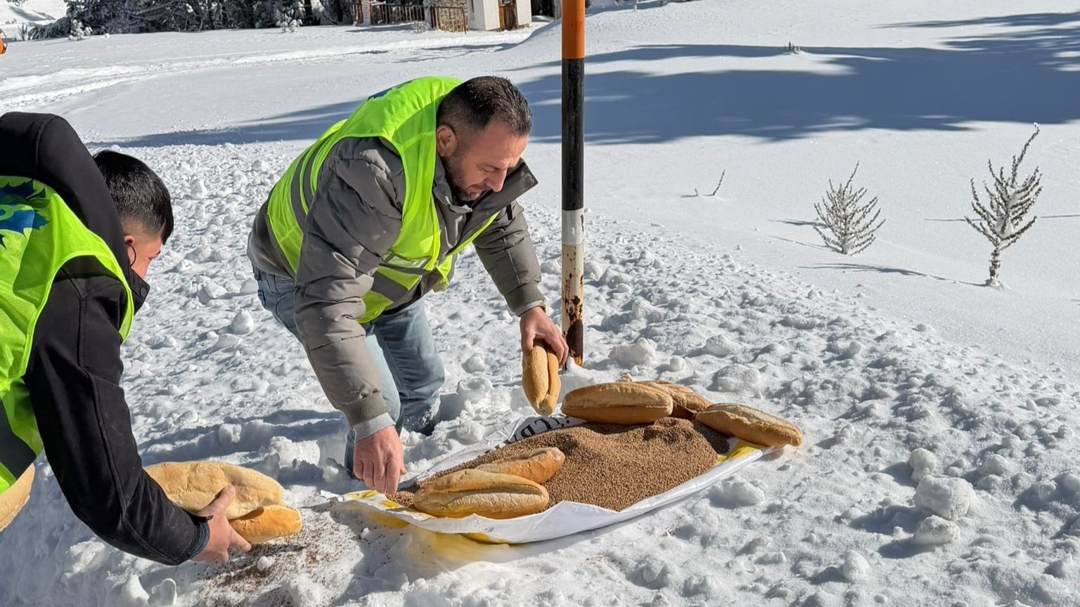 Merzifon Belediyesi ekipleri, araçlarla taşıdıkları ekmek ve yemleri ormanlık alana ulaştırdı.