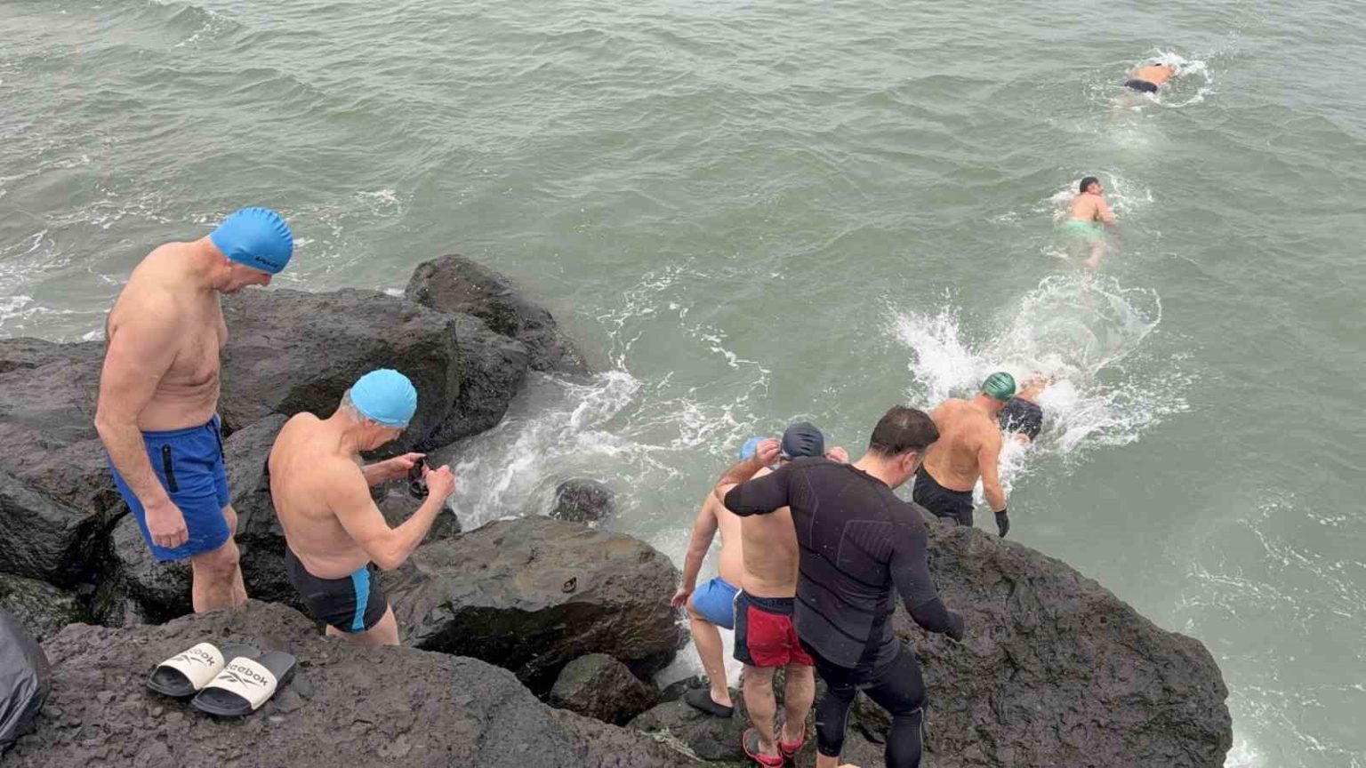 Samsun’da farklı yaş ve meslek gruplarından oluşan yaklaşık 10 kişilik bir arkadaş grubu, yeni yılın ilk gününde kar yağışı altında Karadeniz’in buz gibi sularında yüzerek unutulmaz bir deniz keyfi yaşadı.