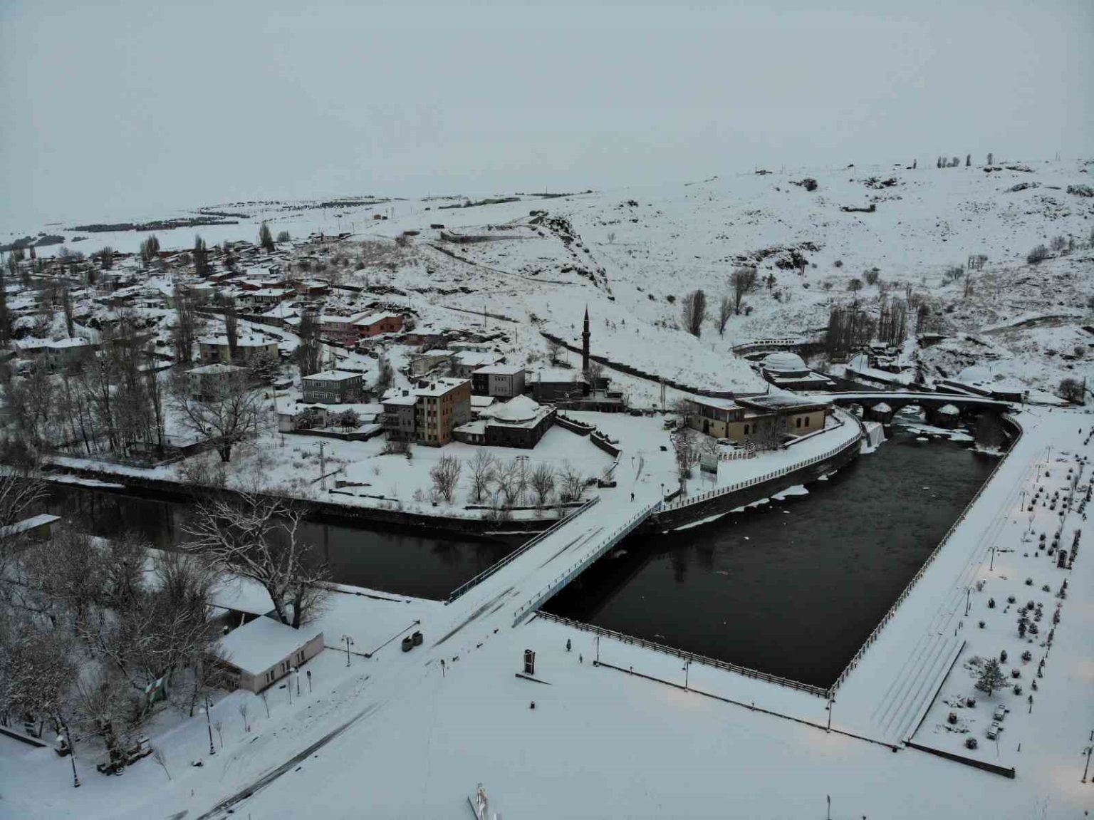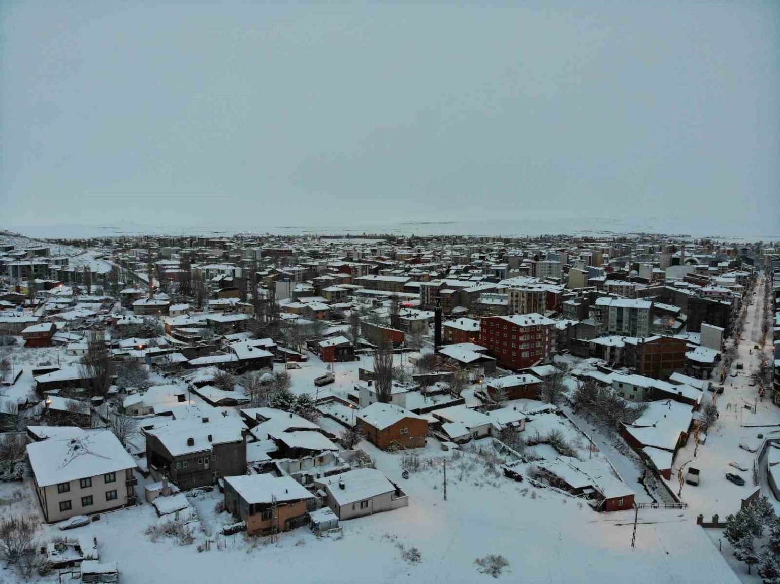 Kars’ta son 15 yılın en yoğun kışı yaşanıyor. Kentte 2 gündür yaşanan bahar havası yerini kar yağışına bıraktı. Gece sabaha doğru başlayan kar yağışı kısa sürede etrafı beyaza bürüdü. Beyaza bürünen Kars havadan görüntülendi.